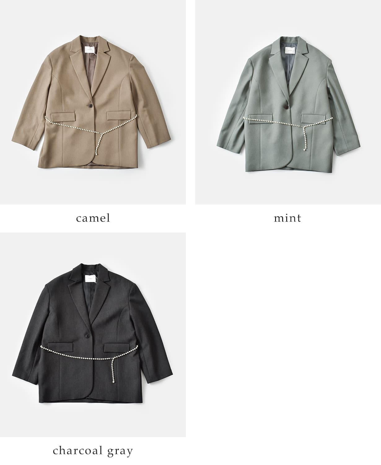 パールベルト付きのテーラードジャケット。ウールライクな生地とニュアンスカラーで重たくなりすぎず、ヴィンテージ感のある雰囲気に仕上げています。