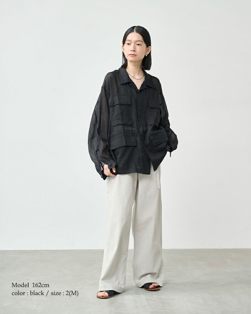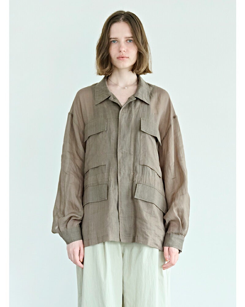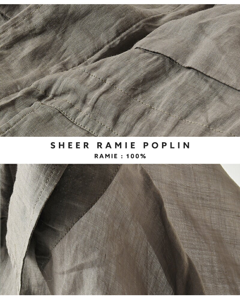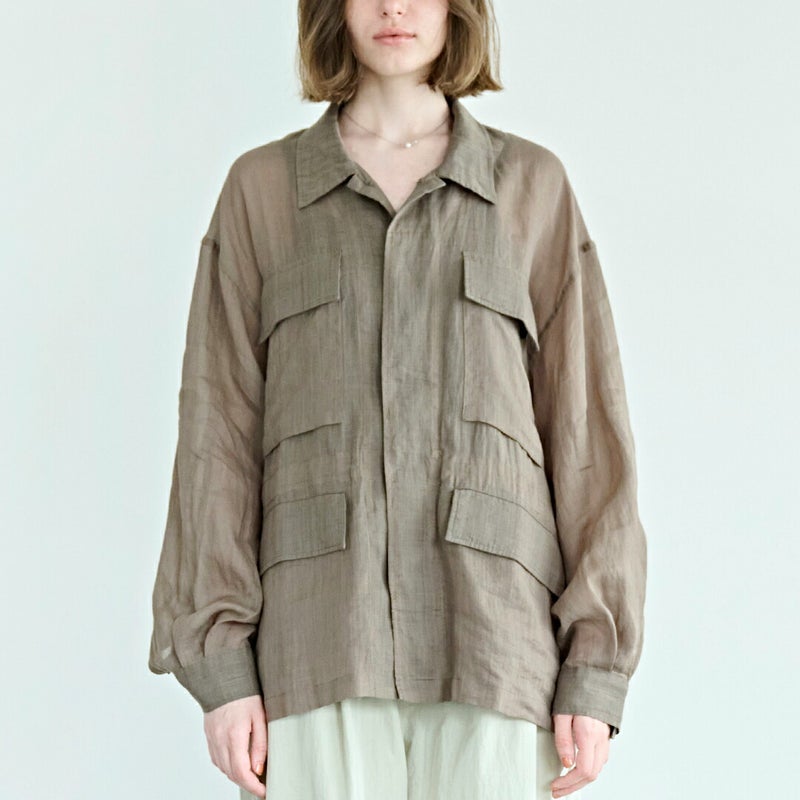 ミリタリー由来の無骨なディテールを、繊細な透け感のあるラミー素材で包み込み、季節感のある軽やかな表情に仕上がった一着。
