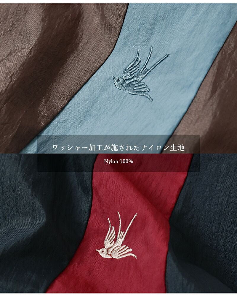 ・表地/ナイロン100% ワッシャー加工を施したナイロン生地で、扱いやすさと動きやすさを両立。 左胸には「RHODOLIRION」のアイコンであるツバメの刺繍も搭載しています。※刺繍糸/レーヨン100%