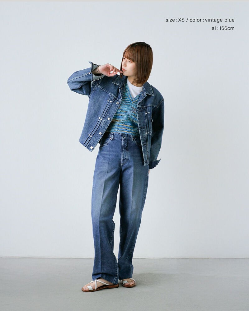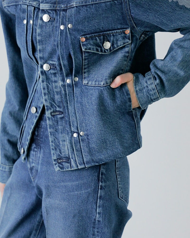 さらに、岡山の熟練職人によって一枚一枚丁寧に仕上げられた 美しいブルーのデニム は、まるで何年も着込んだかのような自然な色褪せを表現。リベットやアクションプリーツなどのディテールにもこだわり、時代を超えて愛される一着に仕上げました。