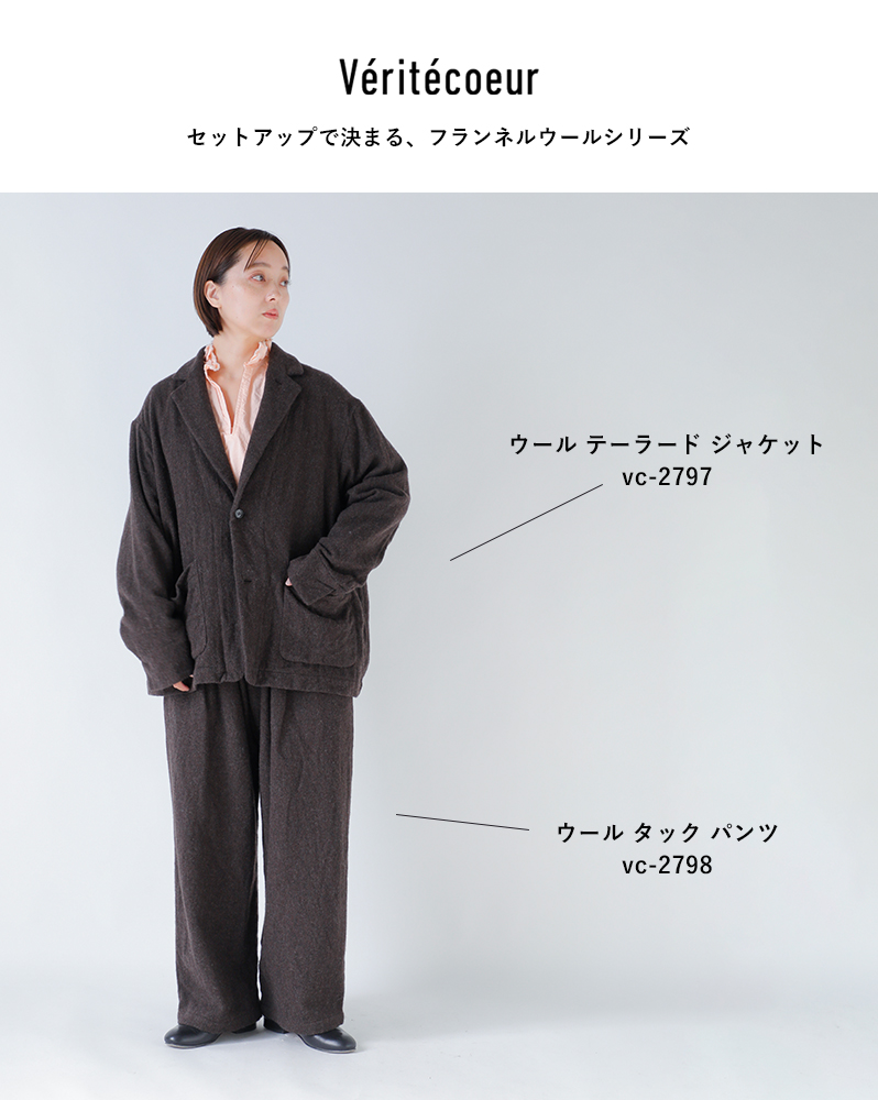 フランネル素材の柔らかな質感、テーラードスタイルからスタンドネックまでアレンジ可能なラペルが特徴のウールジャケット Veritecoeur ヴェリテクール ウール テーラード ジャケット vc-2797 レディース 2025aw新作