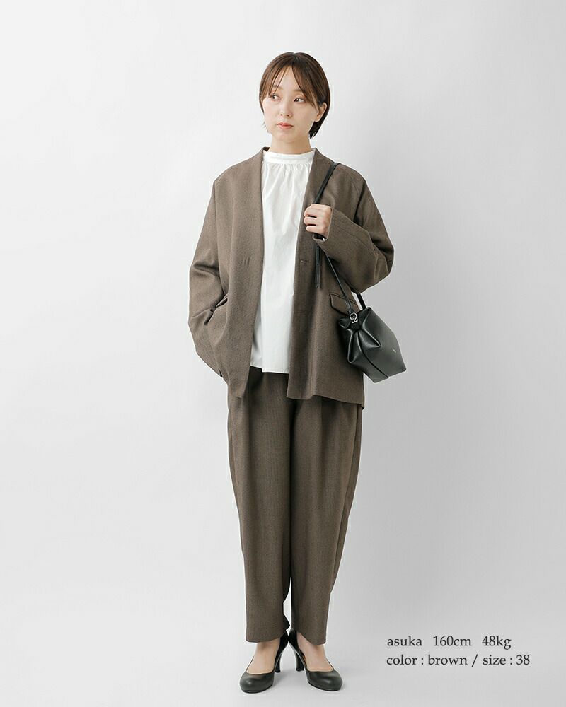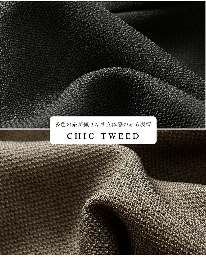 変化を楽しむツイード調素材の魅力 表面変化のある新素材ツイードを使用。多色の糸が織りなす立体感のある表情が特徴で、シンプルなシルエットに豊かな奥行きをプラスします。柔らかく程よいハリ感があり、上品な着心地と美しいドレープを実現。フォーマルシーンにも対応できる高級感のある仕上がりです。
