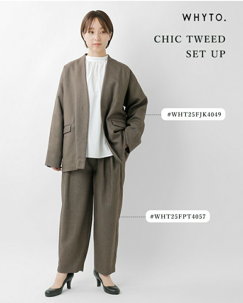 ツイード調素材を使用したマニッシュな雰囲気がありながら柔らかいカーブパターンで女性らしく仕上げたジャケット 【クーポン対象】whyto ホワイト シックツイード オーバー ジャケット “chic tweed over jacket” wht25fjk4049 レディース 2026ss新作 春夏