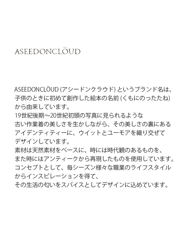 ASEEDONCL?UD (アシードンクラウド) というブランド名は、 子供のときに初めて創作した絵本の名前 (くもにのったたね) から由来しています。 19世紀後期?20世紀初頭の写真に見られるような 古い作業着の美しさを生かしながら、その美しさの裏にある アイデンティティーに、ウイットとユーモアを織り交ぜて デザインしています。 素材は天然素材をベースに、時には時代観のあるものを、 また時にはアンティークから再現したものを使用しています。 コンセプトとして、毎シーズン様々な職業のライフスタイル からインスピレーションを得て、 その生活の匂いをスパイスとしてデザインに込めています。