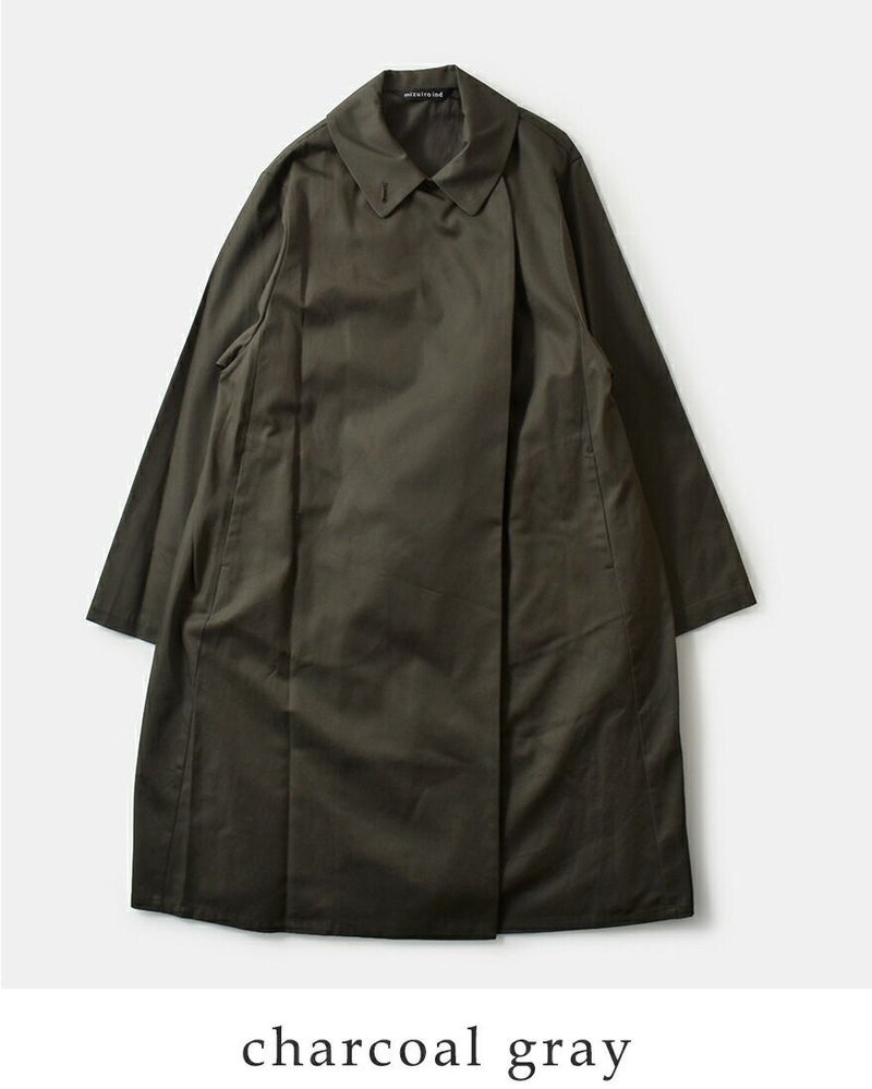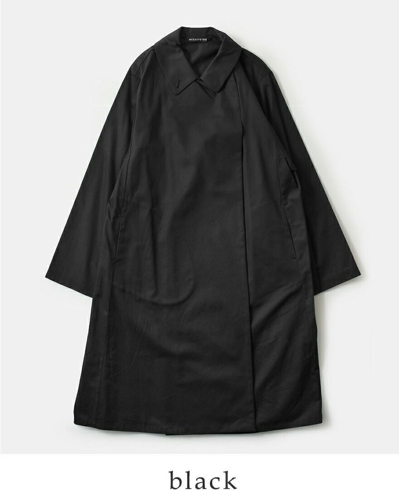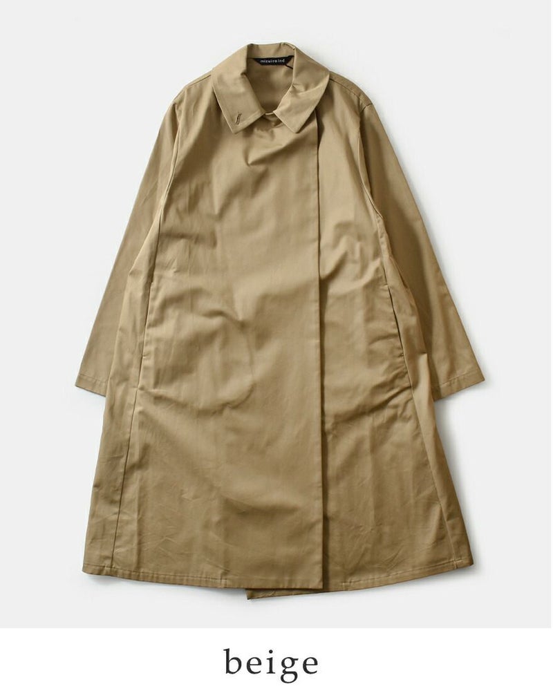mizuiro ind(ミズイロインド)よりコットン トレンチライク コートのご紹介です。ハリとコシのある生地で作られたトレンチライクコートです。一枚仕立てなので軽やかに仕上がっています。ミニマルでミリタリーライクな雰囲気もあり、すでに在るようで無いコートを表現。襟元はボタン留めで立てて着用可能。4色のカラー展開はベーシックで揃え、極限までシンプルに、トレンチコートをベースに長く愛用していただけるよう拘りを持ってデザインされています。季節の変わり目、気温の変化にすぐに対応できる今季お勧めの1枚です。