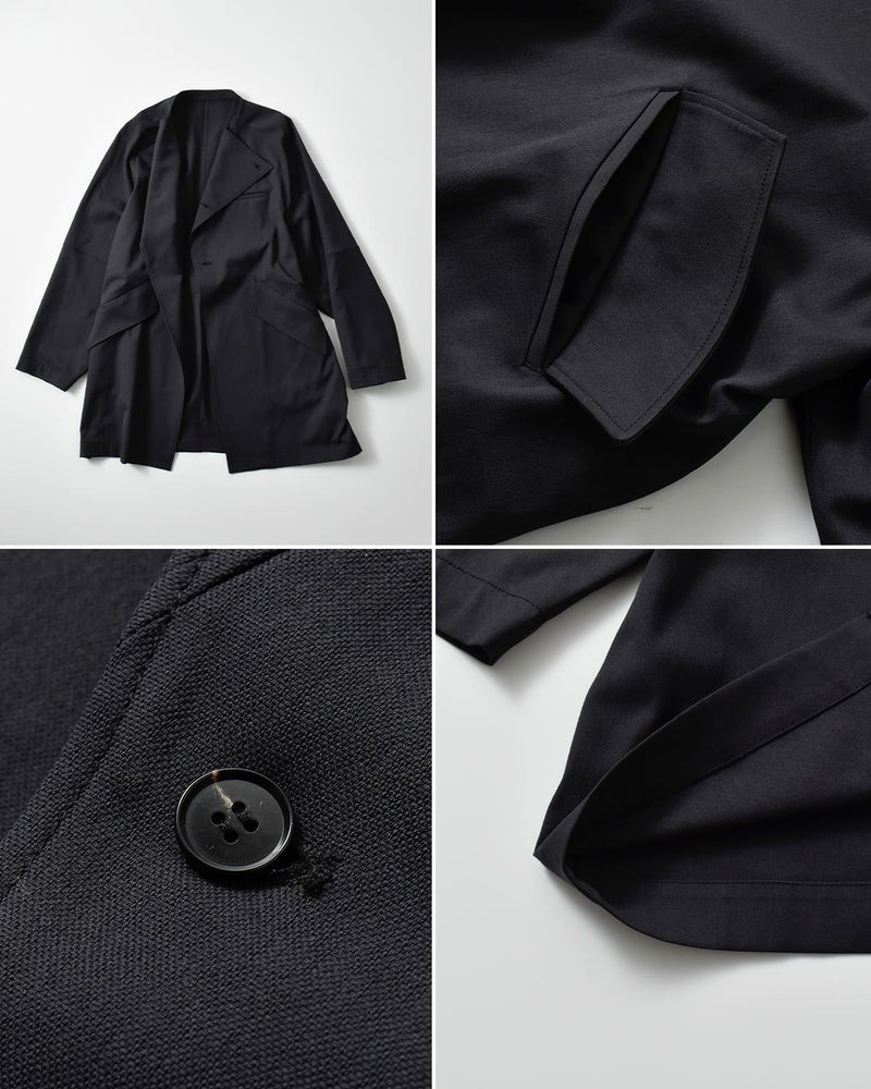東レのポリエステル機能糸「Sheltering dry」を使用した生地を採用。給水速乾性に優れ、シワになりにくい特性を持ち、軽やかで羽織りやすい素材感が特徴です。