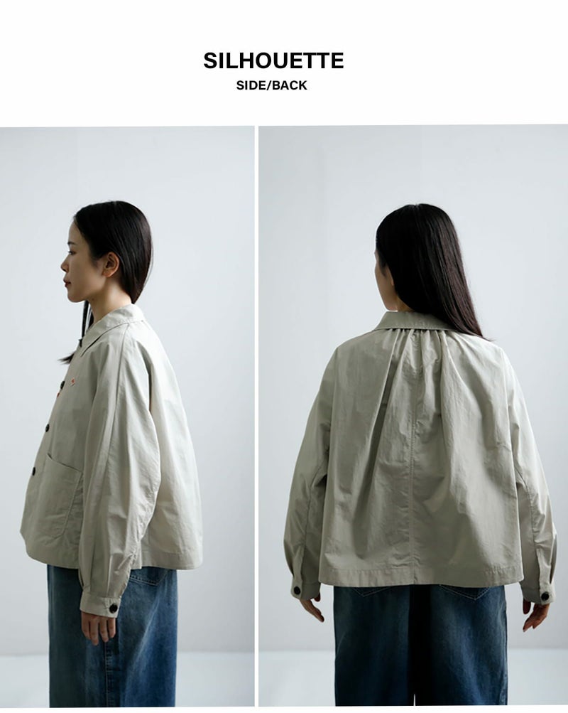 1枚仕立てで軽く着用できるナイロンオックスのショートコートです。Aラインシルエットと袖のドルマンスリーブのデザインが特徴です。