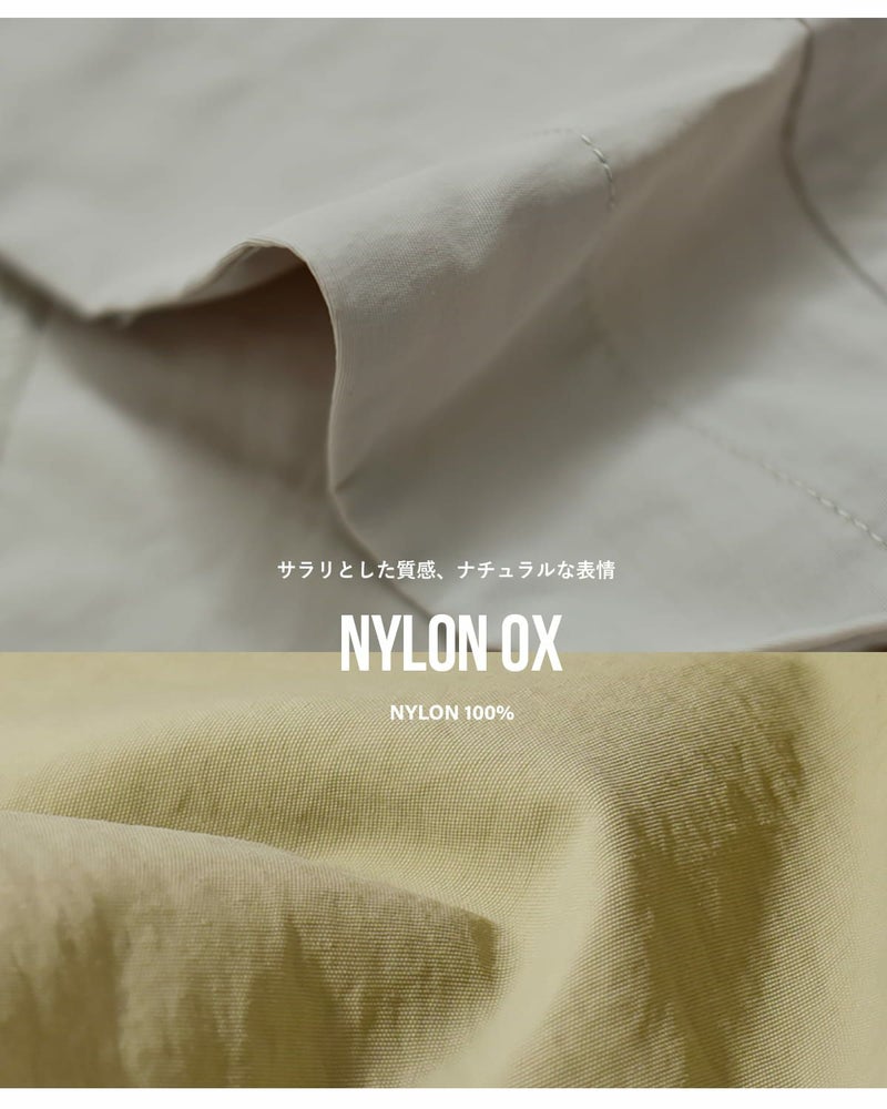 生地には比較的薄手で軽やかな着心地のナイロンオックスを使用。サラリとした質感とマットでナチュラルな風合いが特徴です。ナイロンオックスの生地に洗いをかけることで、表情が出て雰囲気のある生地に仕上がっています。季節の端境期にも着用しやすい程よい厚みの生地です。