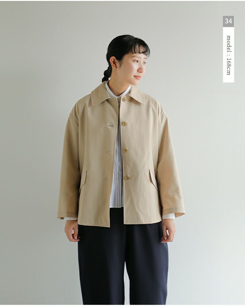 襟を寝かせると、すっきりとしたクラシカルな印象に。シャツやニットの襟を覗かせると軽やかな雰囲気で、デイリーにも通勤にも合わせやすいスタイル。
