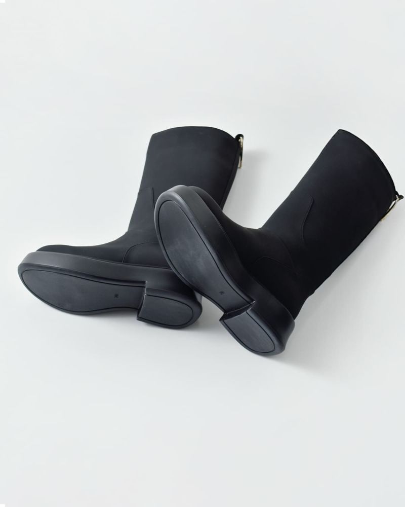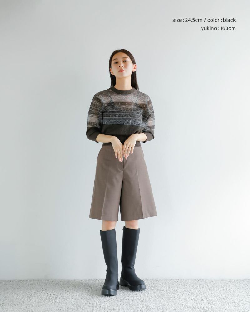 脚を真っ直ぐに見せる直線的な筒が特徴的。細身ながらも5cmソールで安定感があり、美脚効果をプラス。デイリーの通勤、休日のお出かけ、雨の日コーデにも合わせやすい万能なシルエットです。