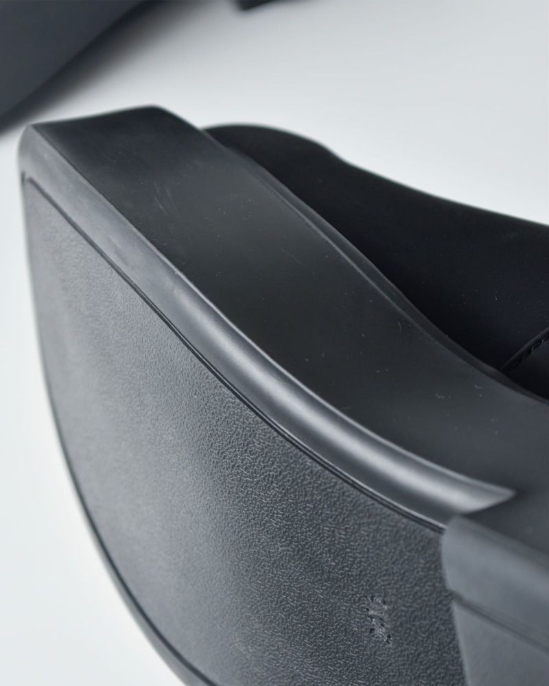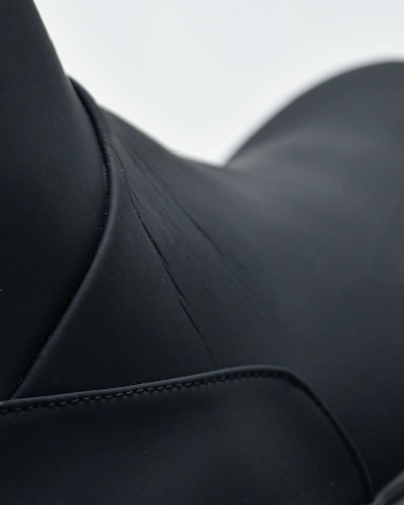直線的で無駄のないシルエットがモードな印象を与え、シンプルながら存在感を放つ雰囲気。撥水素材により雨の日にも対応可能。実用性もファッションも妥協しない、現代女性の日常に寄り添うPurpredらしい一足です。