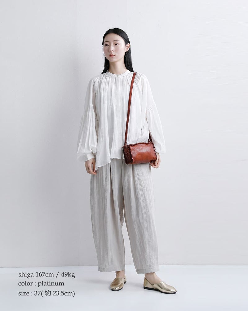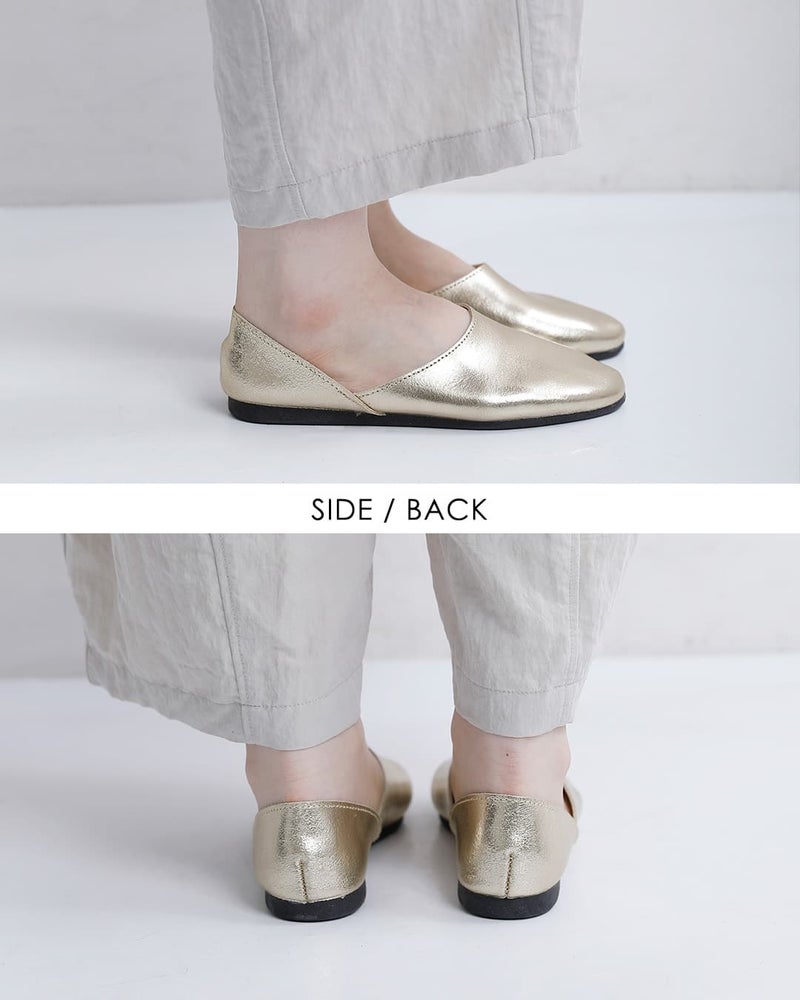 光をやさしく反射するメタリックカラーは、シンプルなコーディネートのアクセントになるだけでなく、足元を明るく見せ、全体を軽やかな印象へと導きます。