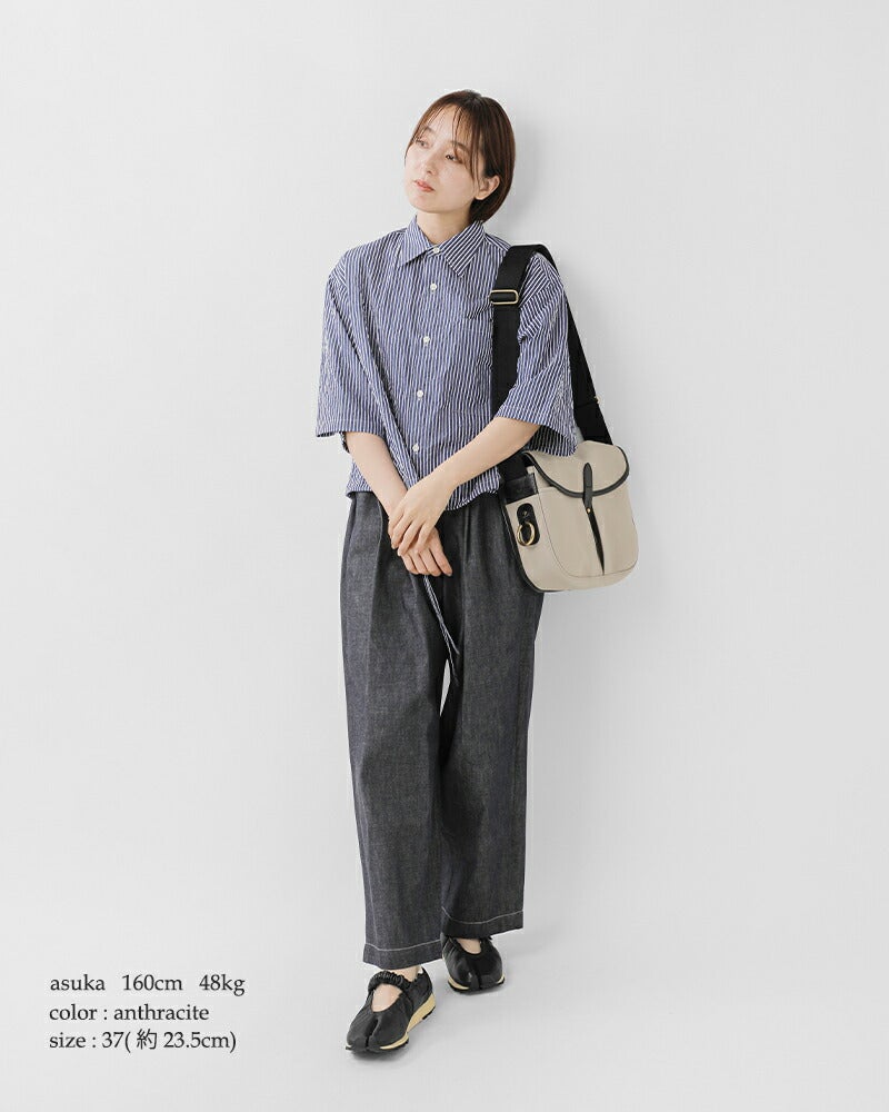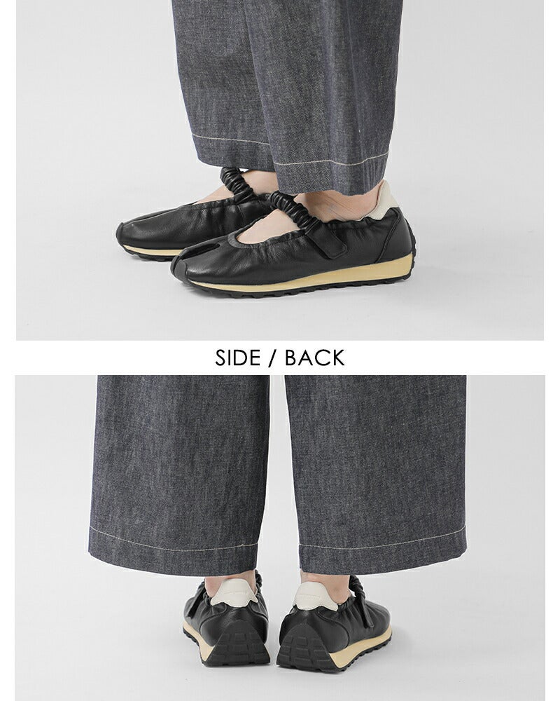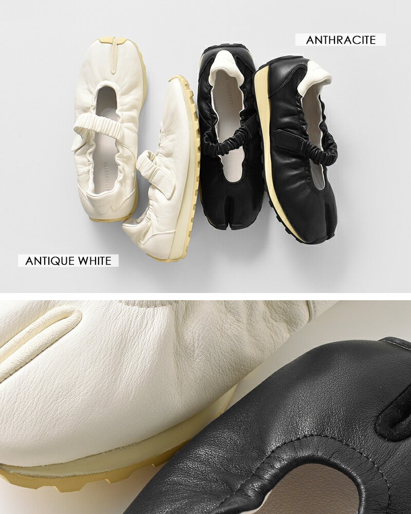つま先のタビデザインが印象的な、すっきりとしたシルエット。 甲をやさしくホールドするワンストラップと、程よく厚みのあるソールがバランスよく、パンツにもスカートにも合わせやすい一足です。
