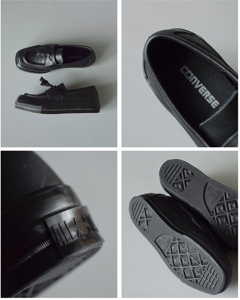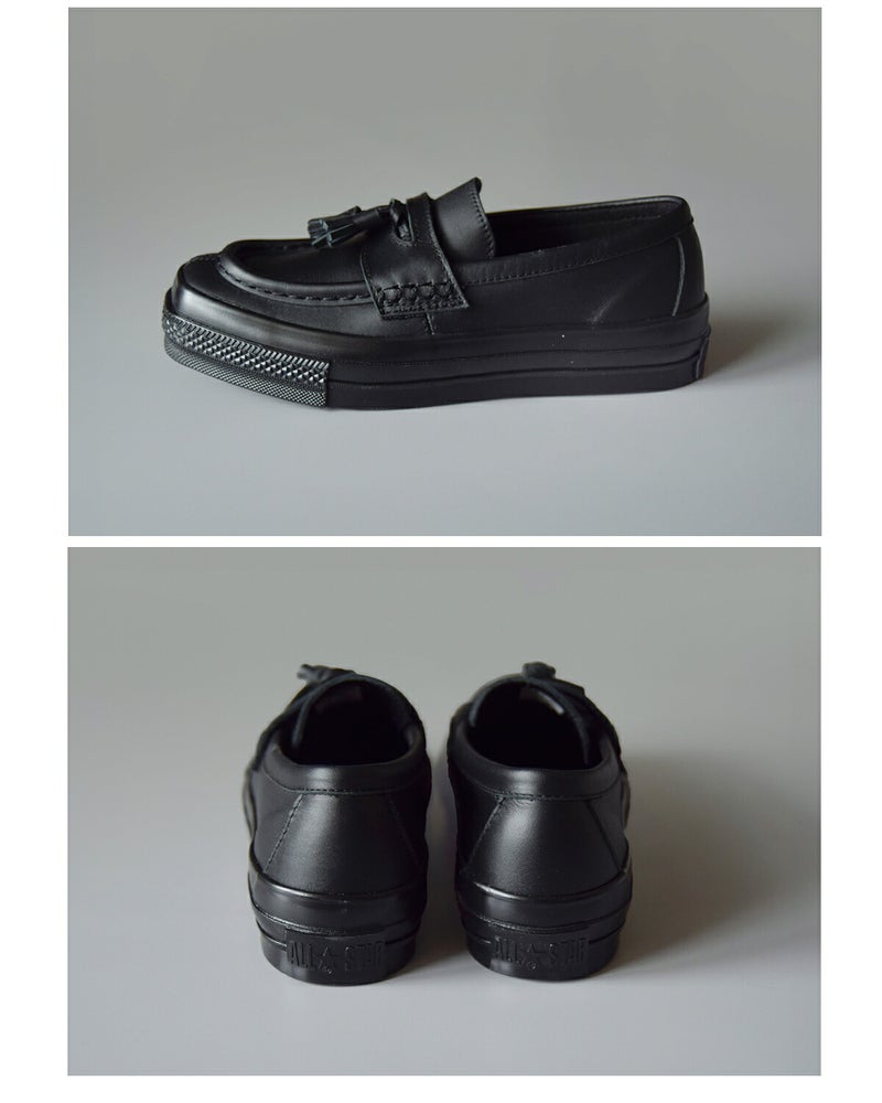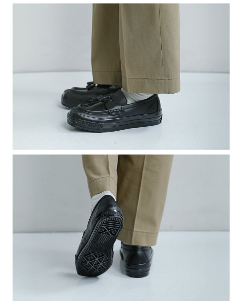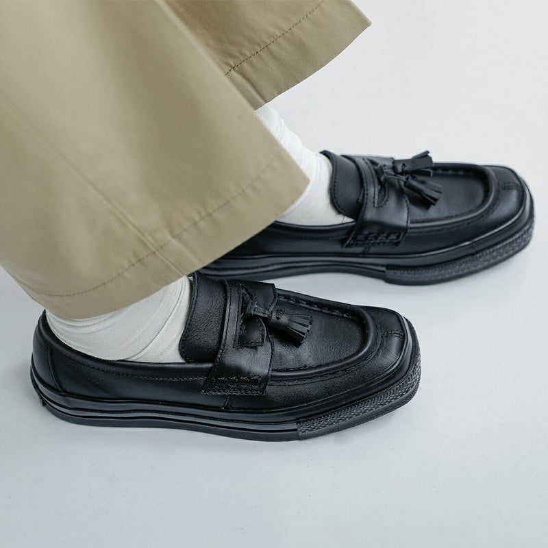 最大の特徴は、印象的なスクエアトゥ。丸みのある従来のオールスターとは異なり、直線的なラインが加わることで、ぐっとモダンで洗練された表情に仕上がっています。パンツの裾から覗いたときのシャープなラインが、コーディネート全体を引き締めます。さらにローファーパターンを採用することで、トラッドな要素をプラス。スニーカーでありながら、ジャケットやスラックスとも好相性です。揺れるタッセルがクラシカルな雰囲気をプラスします。
