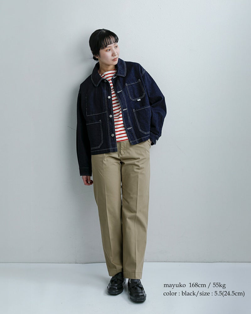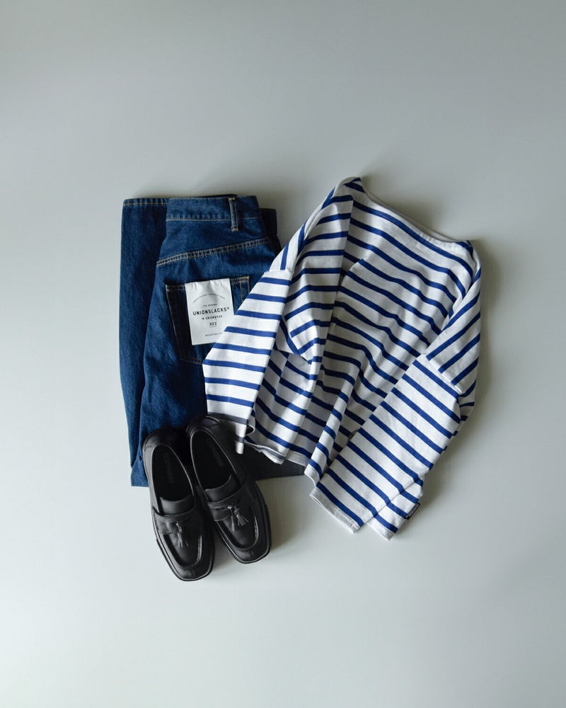 デニム+ボーダーに合わせてベーシックなフレンチルックにもおすすめ。センタープレスパンツ+シャツで通勤スタイルに、ロングスカート+ソックス合わせで程よくトラッドにきめるのも◎。ホワイトやグレージュのソックスと合わせると、今っぽさが引き立ちます。