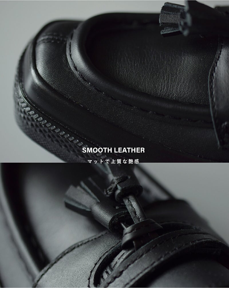 アッパーには、ほどよいツヤ感が美しいスムースレザーを採用。表面はなめらかで均一感があり、カジュアルなローファーデザインでありながらも品のある印象を演出します。マットすぎず、かといって主張しすぎない絶妙なバランスが、大人の装いに自然と溶け込みます。