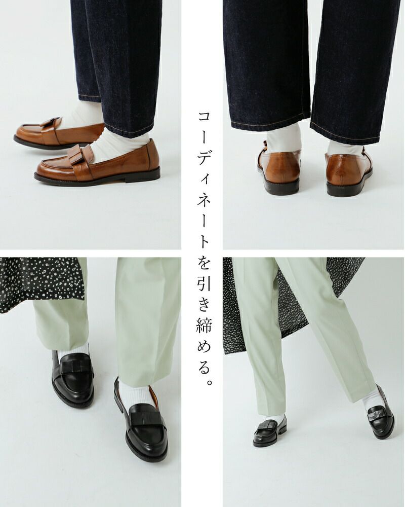 ローファーのフォーマルな印象はそのままに、アッパーにリボンをあしらうことで女性らしく、大人にちょうどいい甘さが生まれています。つま先に向かってスリムにラウンドしたアッパーが足をすっきりと見せます。