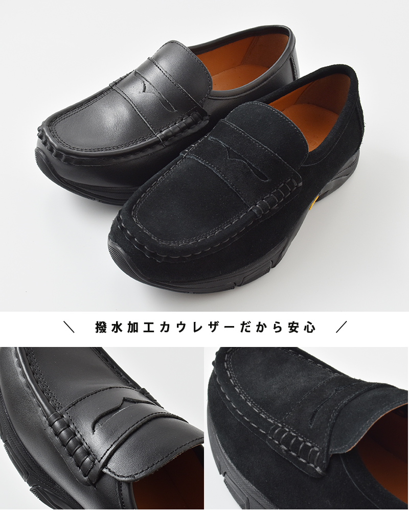 しっかりとステッチがほどこされたクラシカルなコインローファースタイル。つま先やかかとまでしっかりとソールが巻き上がっています。甲の裏側にはゴムが入っていてストレッチするので脱ぎ履きも楽ちん♪ソールのビブラムマークがエッジを利かせます。
