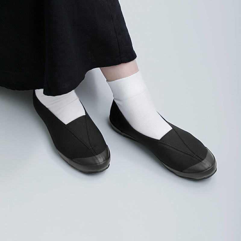 甲に三角形のゴムを配したバレータイプ。上履きにも見られるクラシックなデザインをベースに、シルエットを細身にし、ソールには十分な厚みを持たせました。