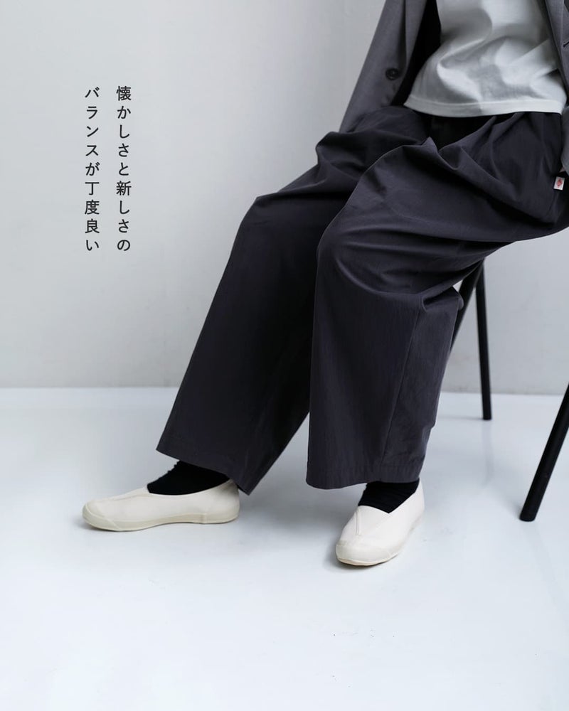 しっかりとハリのあるキャンバス素材が、とても爽やかな印象。本体カラーと合わせた丁寧なステッチも統一感があって程よいアクセントになっており、デイリーに使いやすい一足に仕上がっています。