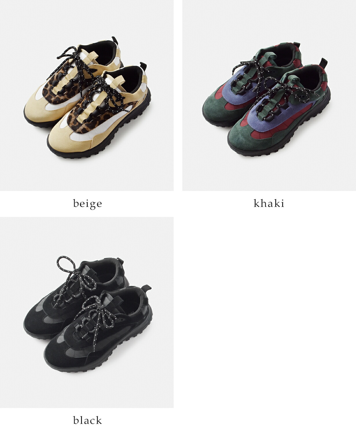曲線のカッティングで生地を組み合わせた独創的なデザイン。シューレースは耐久性のある丸紐を使用しています。