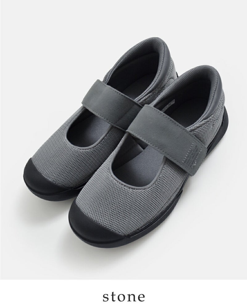 つま先にゆとりのあるラストを採用した「LITTEL STAR 02」をベースにしたデザイン。学生用の上履きのようなシルエットが懐かしさも感じさせる一足です。甲調整可能な面ファスナータイプの仕様でバンドが外れても靴が脱げにくく、転倒を防ぐ構造です。