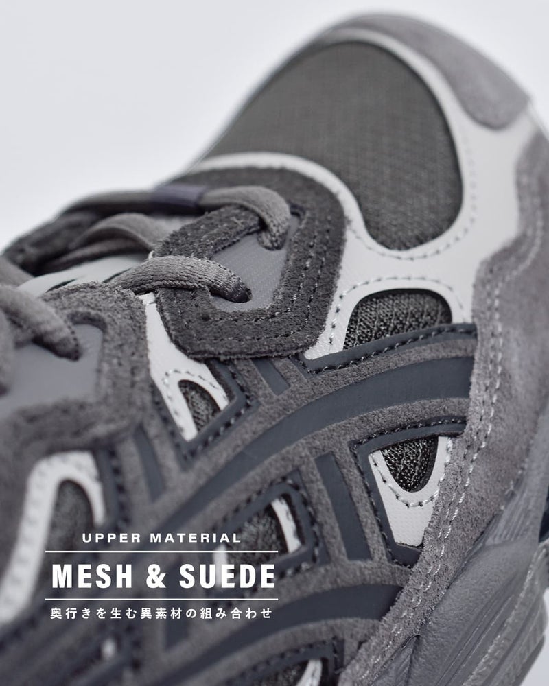 ヘリテージとモダンランニングの要素を掛け合わせたデザインが特徴の一足。アッパーはGEL-NIMBUS 3をベースに、GEL-MC PLUS Vのディテールを融合し、レトロな表情に奥行きをプラスしています。