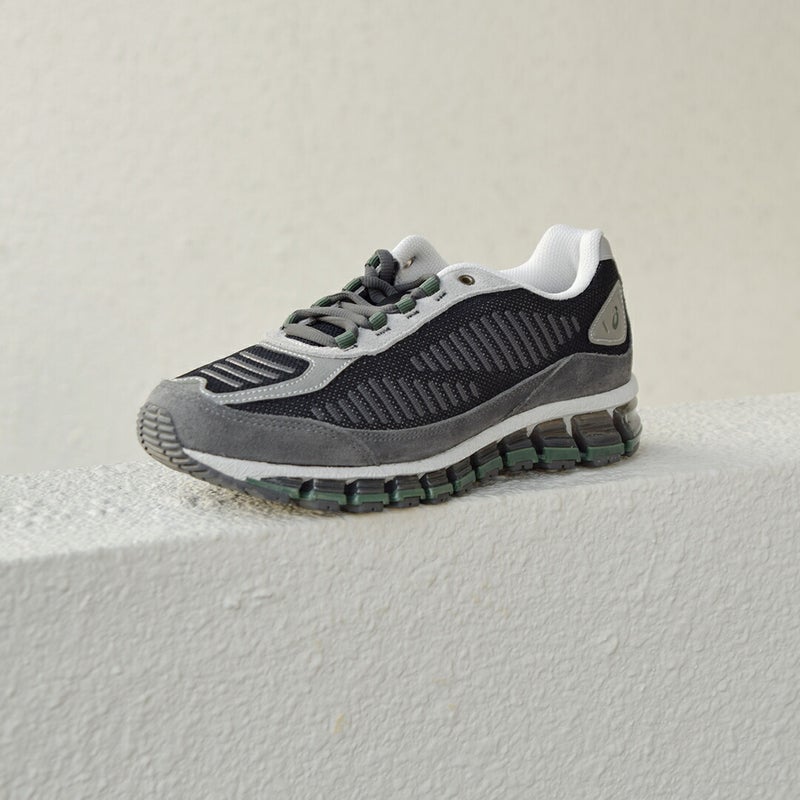 アッパーはクローズドメッシュをベースに、控えめなブランディングを施し、立体感と奥行きのある表情に。スポーツ由来の高機能を感じさせながらも、タウンユースに馴染む洗練された佇まいです。