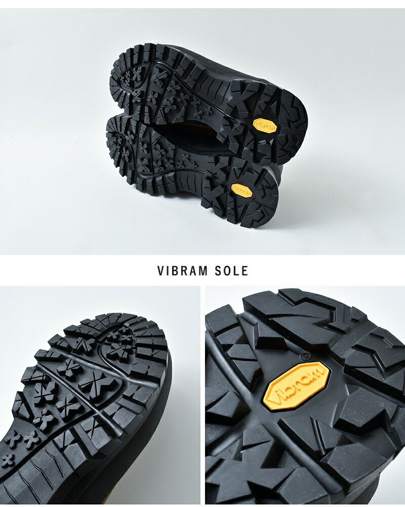 ソールにはVibram社製トレイルラン用ソールを採用。細かく深い溝の入ったパターンが、濡れた路面でもしっかりとグリップし、優れた防滑性を発揮します。タウンユースからアウトドアシーンまで、あらゆる場面で安定感のある歩行をサポートします。