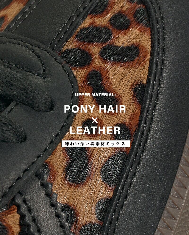 マットな艶感が美しいポニーヘアと上質なレザーを掛け合わせたアッパー。大人でも挑戦しやすい、落ち着いた色味のチーター柄は、取り入れるだけでワンランク上のスタイリングに。