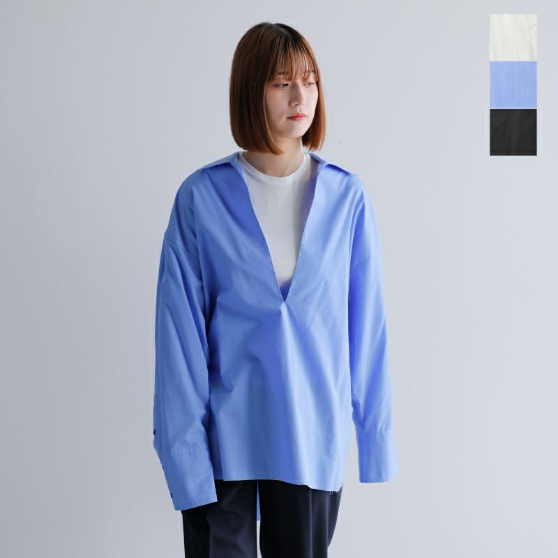 深めのV開きのスキッパーデザインで、抜け感のある表情を演出。