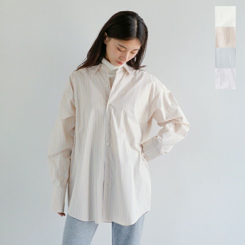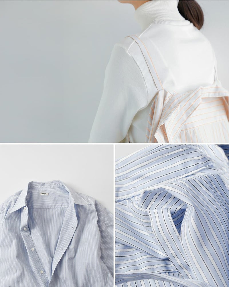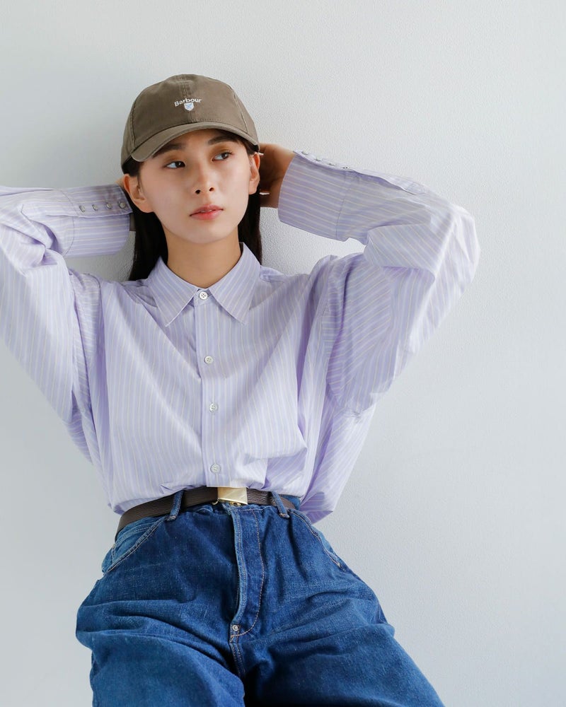 最高級とされる繊維長35mm以上のコットンを使用し、国内外のブランドから支持を受ける「東播染工」が製造する播州織のシャツ地を採用。高密度に織られた細番手のコーマ糸によって、ぬめりある光沢と肌摩擦の少ないしなやかさを実現。洗いをかけるたびに風合いが増し、着る人それぞれの一着へと育ちます。オーバーサイズながら、全体のバランスと袖丈を調整することで、だらしなさを感じさせない計算された設計。Tシャツのように気軽に、ドレスシャツのように品よく、現代の気候や日常に寄り添う機能的なディテールとして、内側にはショルダー掛け・背負い用のストラップを追加。静かなオーラと、確かな実力を備えたシャツです。
