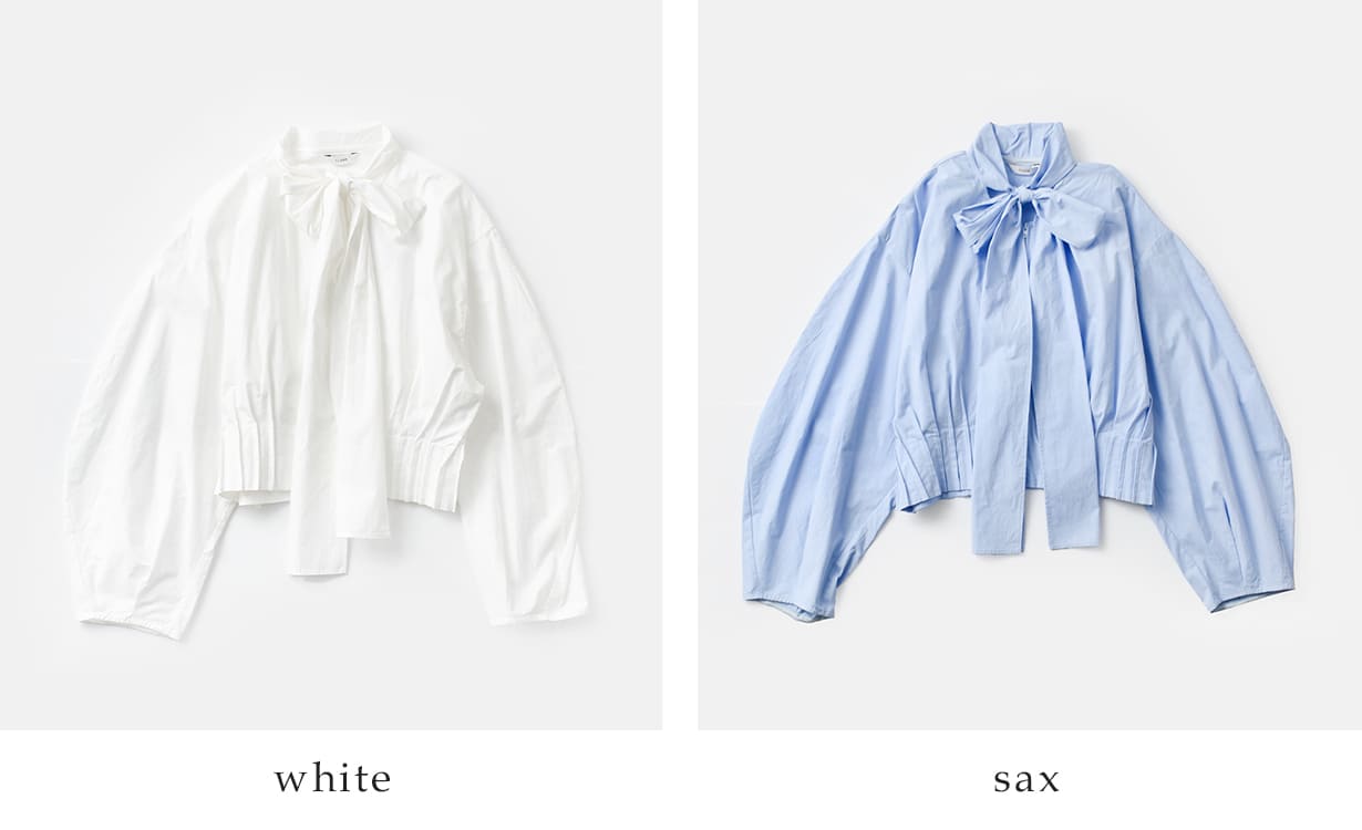 首元の大きなリボンがポイントのシャツ。高密度のしなやかなシャツ地で仕立てられたブルゾン風のデザインが特徴です。丸みのあるスリーブラインと、立体感を生むヘムタック、そして存在感のあるビッグタイディテールが印象的。