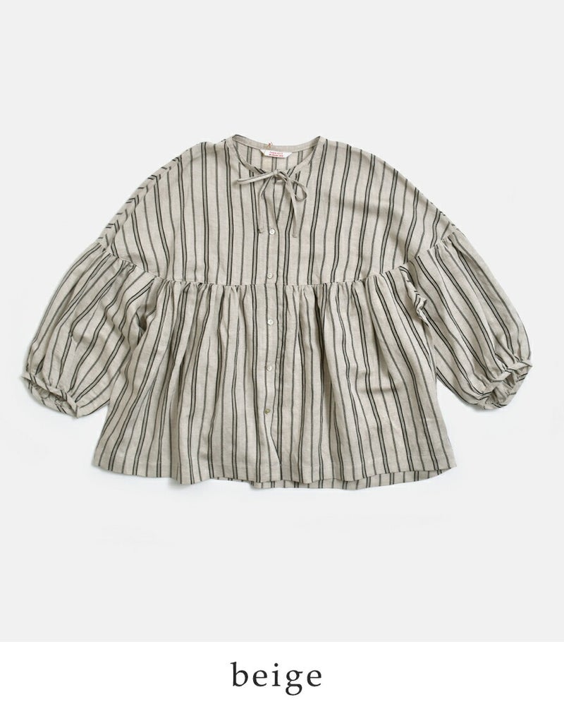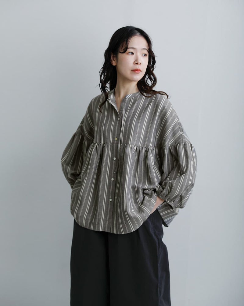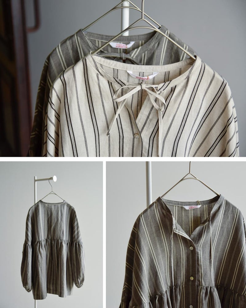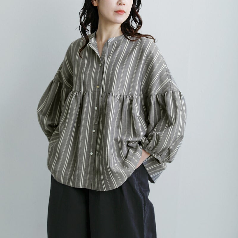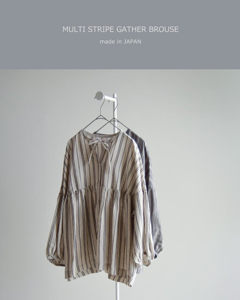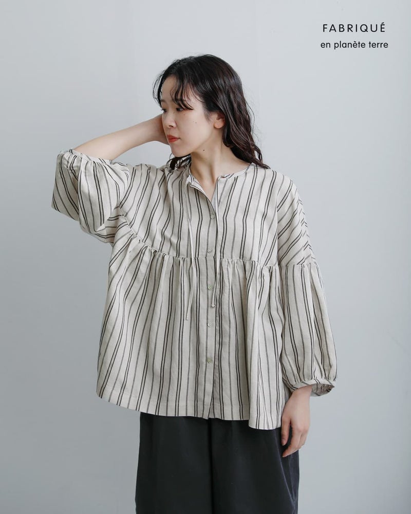 fabrique en planete terre(ファブリケアンプラネテール)より、マルチストライプ 9分袖ギャザーブラウスのご紹介です。やさしい配色のマルチストライプが目を引く一枚。繊細なラインの重なりが、コーディネートに程よい華やかさと奥行きをプラスしてくれます。主張しすぎない配色で、日常のコーディネートに自然に溶け込みます。