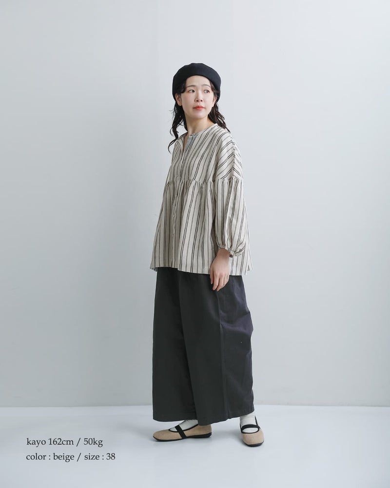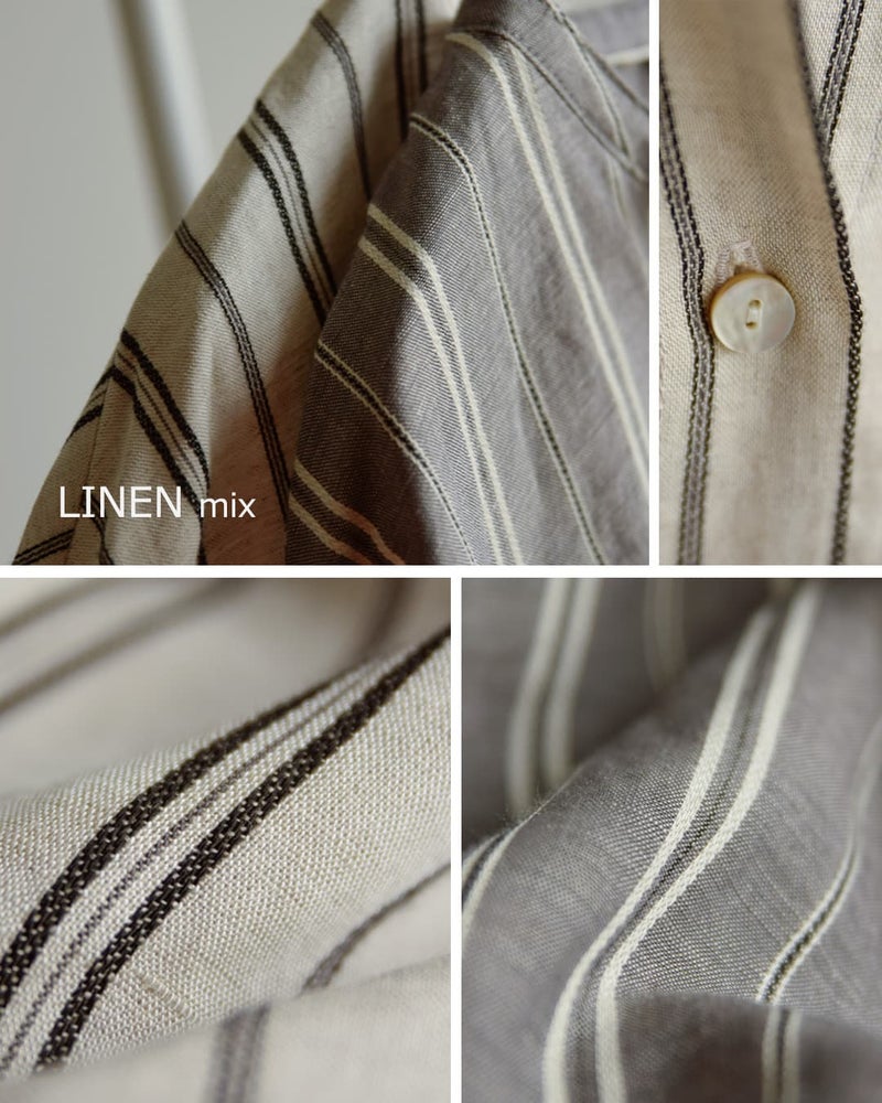 ■麻44%/レーヨン43%/ポリエステル13%素材にはさらりとしたリネン生地を使用し、肌離れがよくロングシーズン快適に着用可能。レーヨンが入っているので、しなやかなドレープ感もあり、シルエットを美しく保ちつつ、ナチュラルな風合いも楽しめます。
