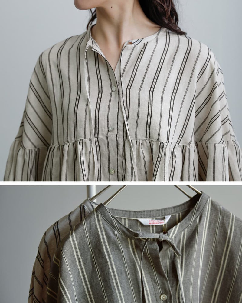 首元はさり気なく開いたスキッパーデザイン。襟もとに付いた紐を結んで首もとを閉じて着用することもできます。