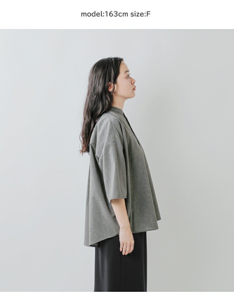 首回りをすっきりと見せてくれるバンドカラーがきちんと感を演出。生地は2重になっており、くっきりと綺麗な形に仕上げています。