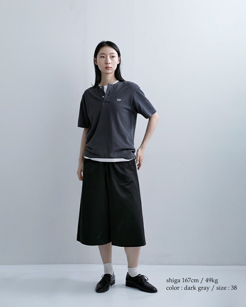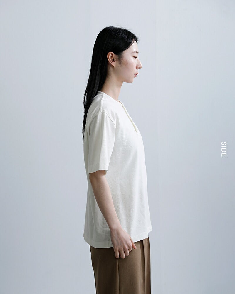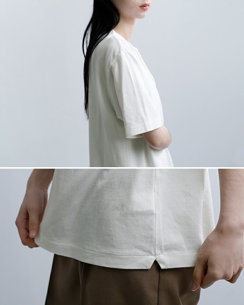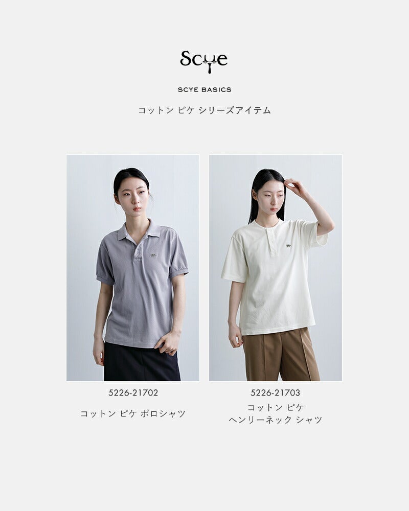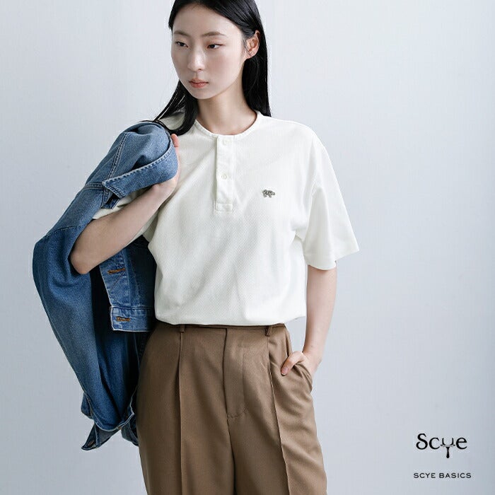 SCYE BASICS(サイベーシックス)より、コットン ピケ ヘンリーネック シャツ Cotton Pique Henley Neck Shirtのご紹介です。このハーフスリーブのヘンリーネックシャツは、程良いゆとりを持ちながらも、上品で着やすいシルエットを実現していて、胸元のブランドワッペンがアクセントになっています。ジャストからやや長めに設定されている丈感は、インアウトどちらもしやすく、ボトムスを選ばずにスタイリングができます。通気性が良く暑い夏でも快適な一枚です。