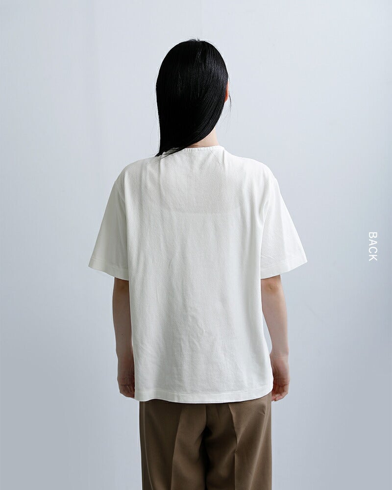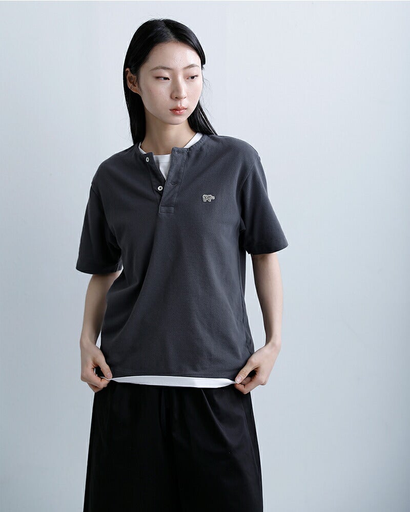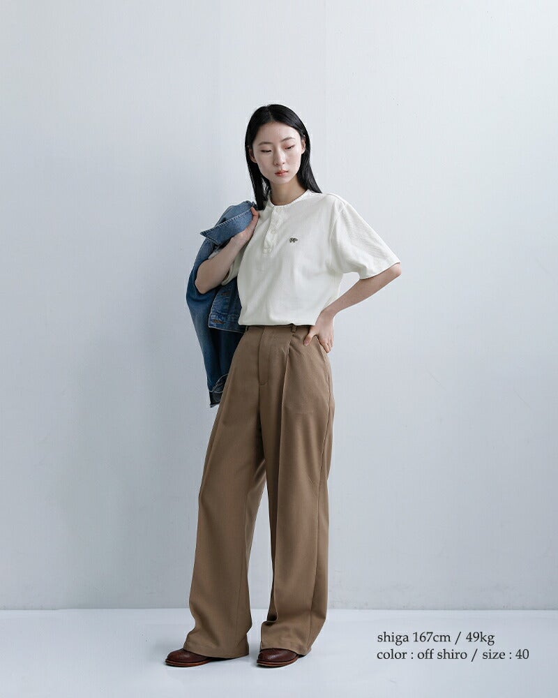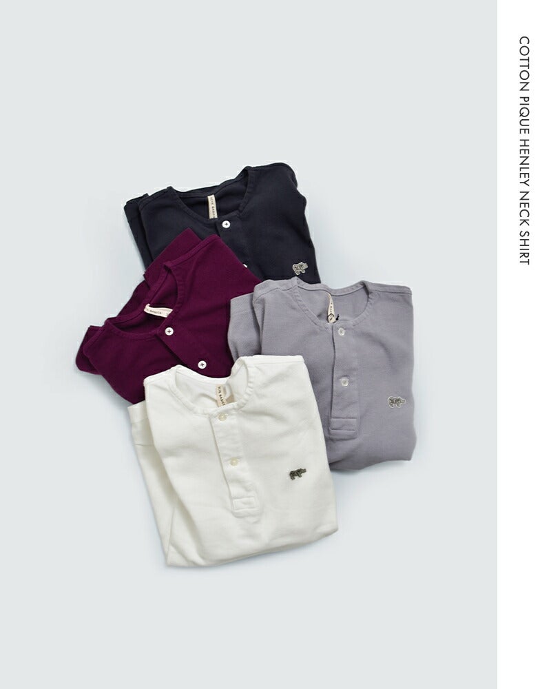 抜け感のあるカジュアルスタイルを叶えてくれるヘンリーネック。首元をすっきり見せ、メンズライクな雰囲気に。さりげないロゴの刺繍がアクセントになり、品のある装いを演出してくれます。