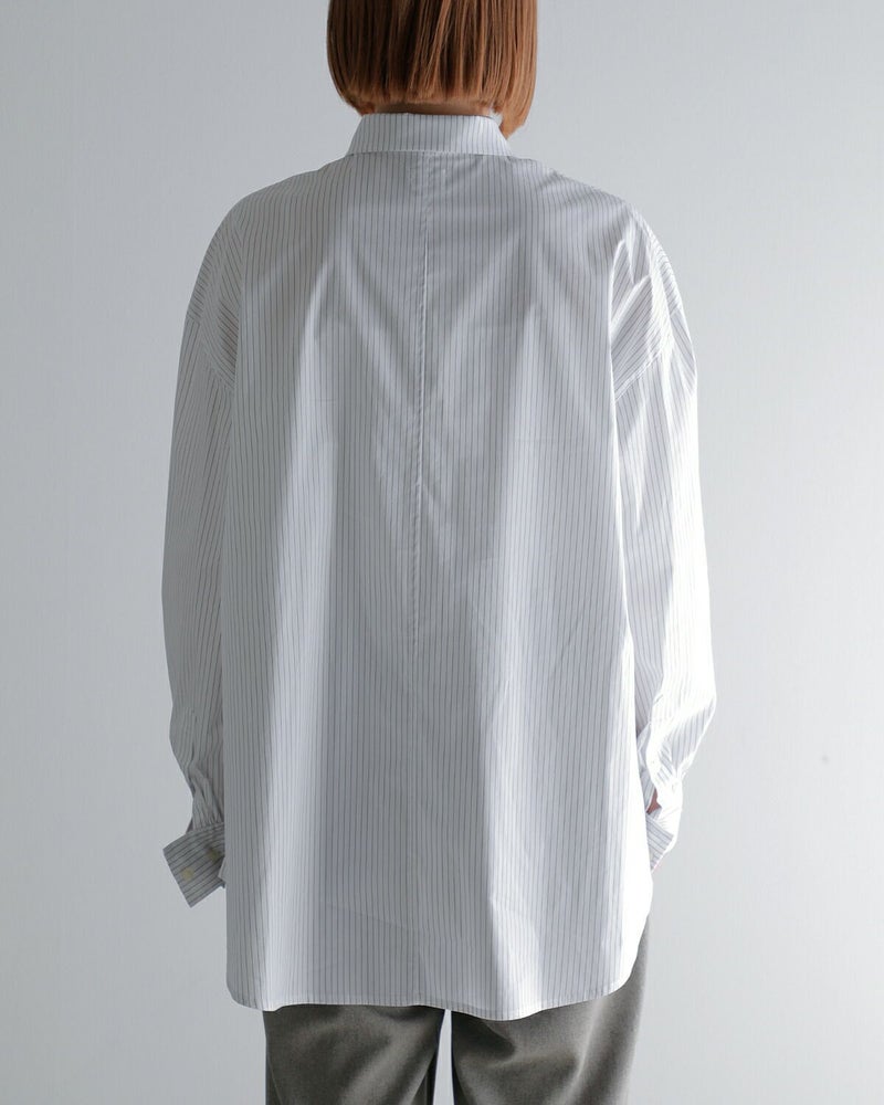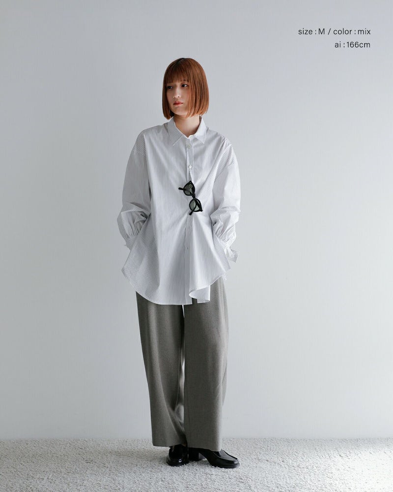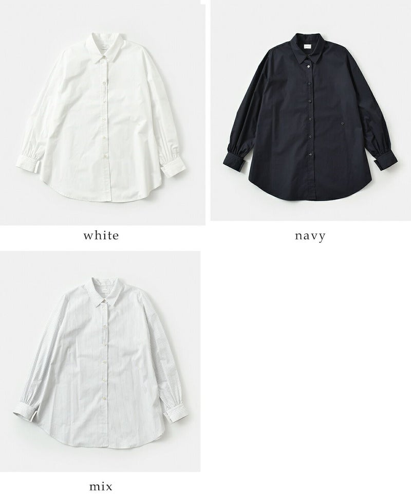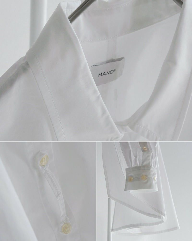 ハリのあるタイプライター素材を使用した、シンプルながらも洗練されたデザインシャツ。メンズライクなゆったりとしたシルエットに、ボリュームスリーブをプラスすることで女性らしさを演出。袖はトレンドのボリュームスリーブで、手元に視線を集める長めのダブルカフス仕様で、ボタンを留めても外しても異なる表情を楽しめます。