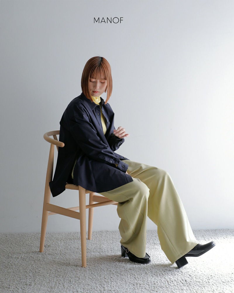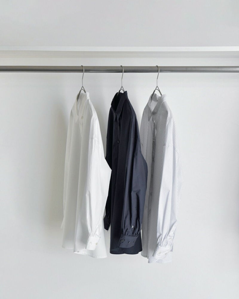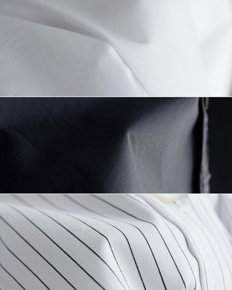 高密度に織られたタイプライター素材を使用し、程よいハリ感と軽やかな着心地を両立。型崩れしにくく、立体的なシルエットをキープできるため、シワになりにくいのも特徴です。さらっとした肌触りで快適に着用でき、オールシーズン活躍する万能な生地感です。