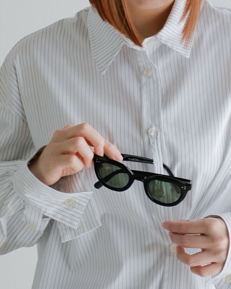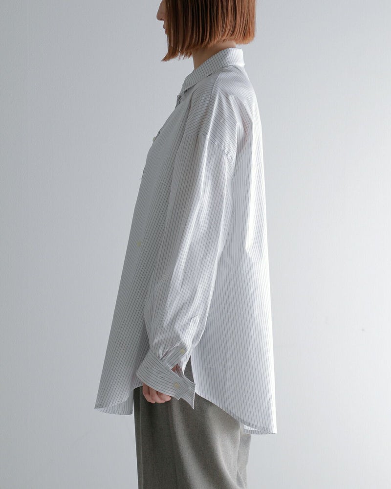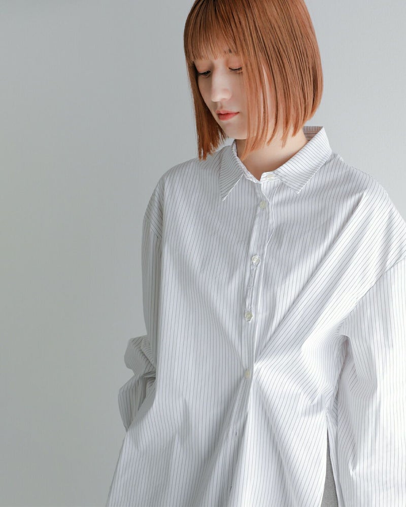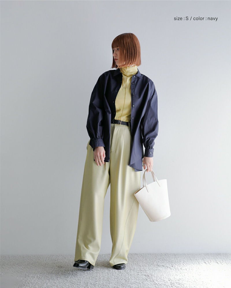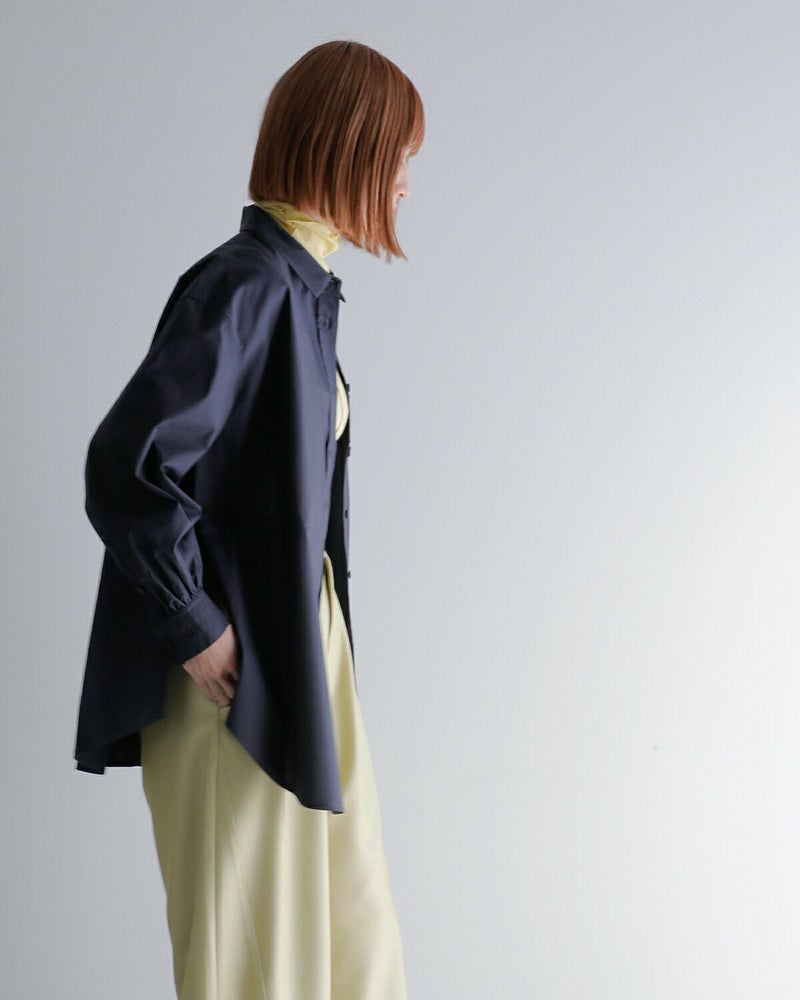 さらに、見頃脇のボタンを留めることで、フロント部分にドレープを加えたアレンジも可能。デニムやスラックスと合わせたシンプルなスタイリングはもちろん、タートルネックをインナーにレイヤードするのもおすすめ。一枚でこなれ感のあるスタイルが完成する、大人のための上質シャツです。