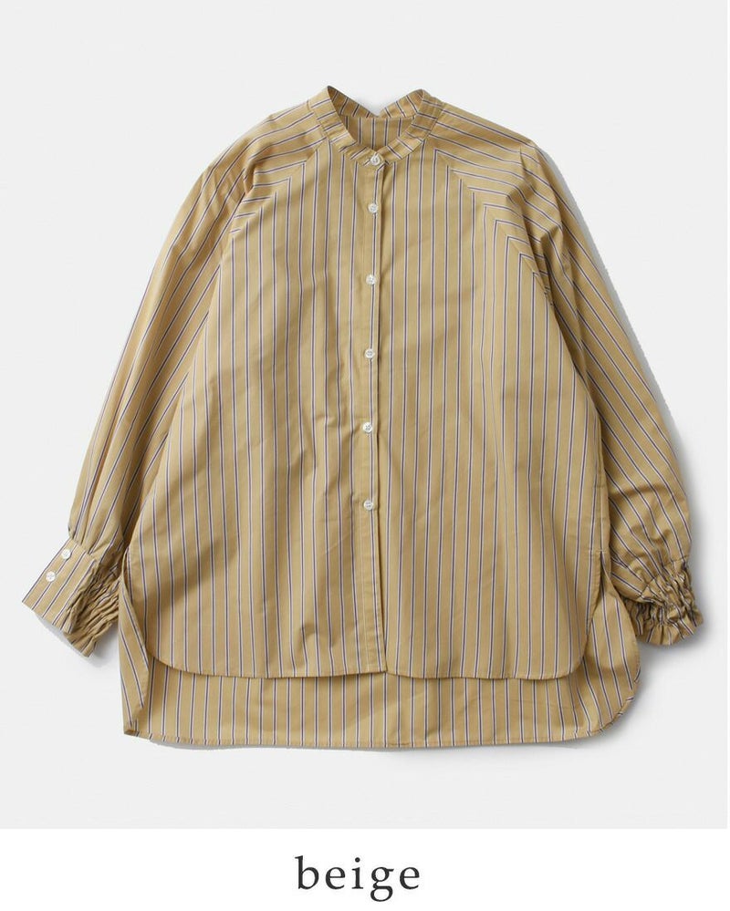 シャーリングの袖口が女性らしい華やかさを加えます。後ろ裾を長めにとった前後差のあるヘムラインで、トップスアウトで着てもこなれた雰囲気になります。サイドスリットが軽やかなアクセントになっています。