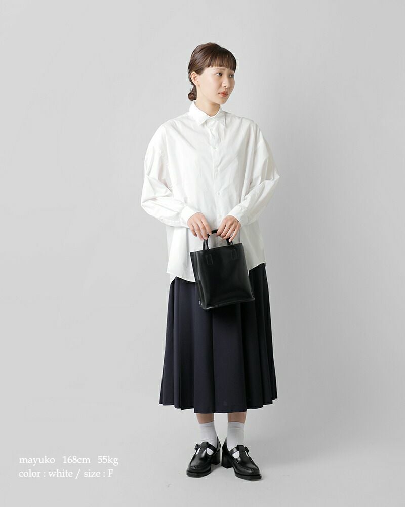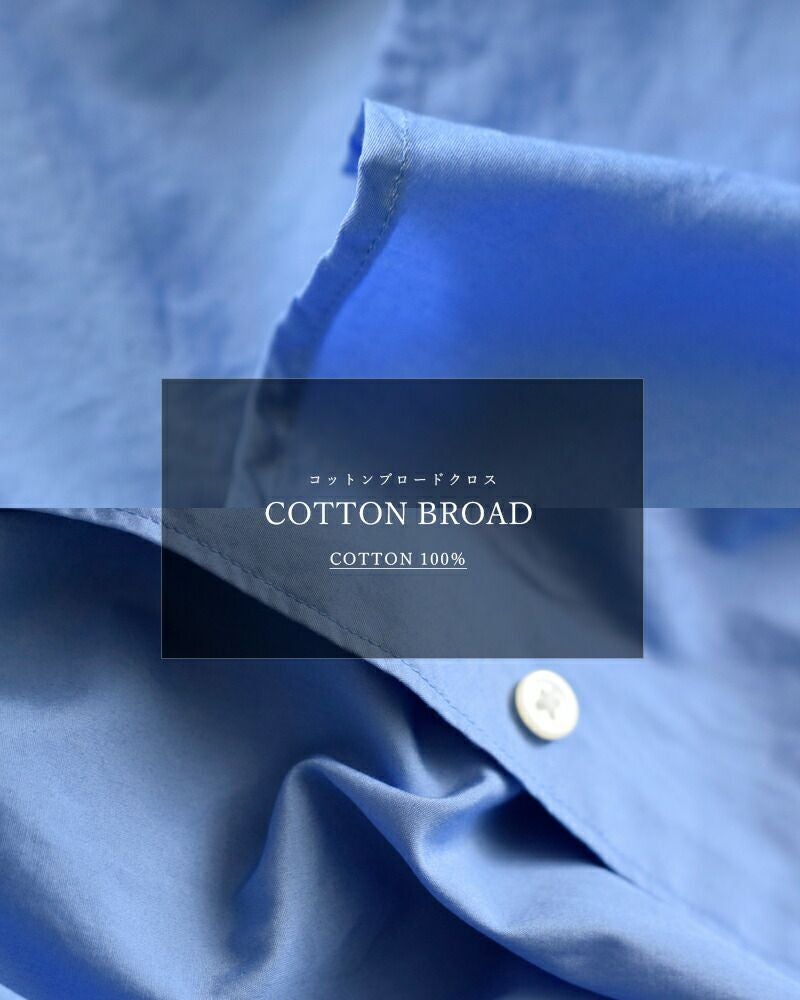 素材には超長綿系の細番手で織り上げたブロードクロスを使用。高級ベッドシーツにも使用されている生地で適度なハリと柔らかさがあり、長いシーズンで着用が可能。また、滑らかな肌触りと光沢感が美しく、オーバーサイズのドレープ感をとてもキレイに表現します。
