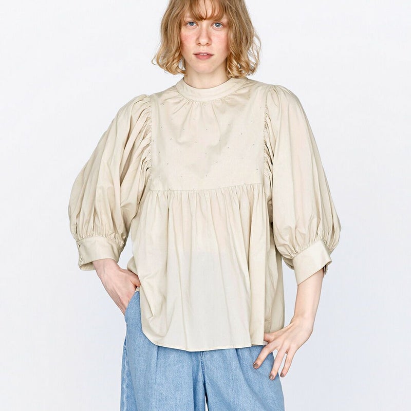 袖にたっぷりとギャザーを施し、丸みのある立体的なフォルムに。 動くたびにふんわりと揺れ、二の腕を自然にカバーしてくれます。