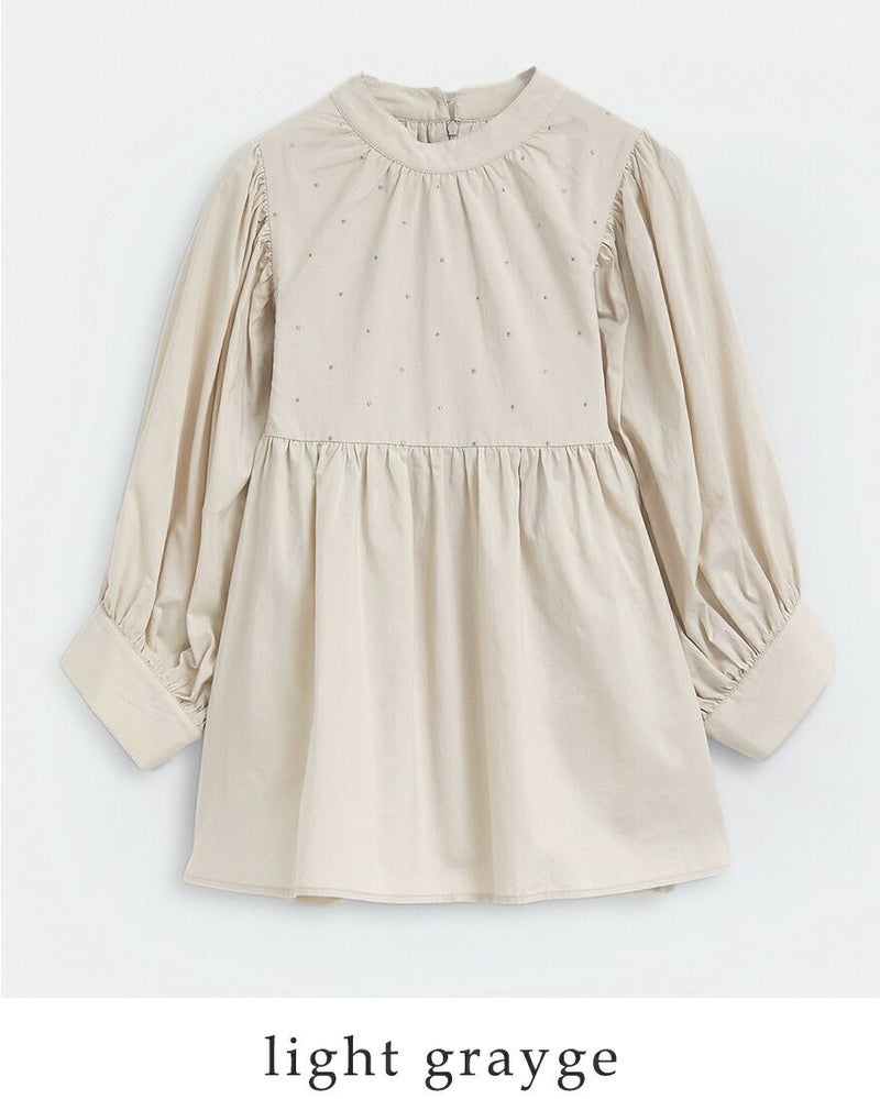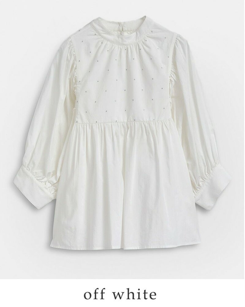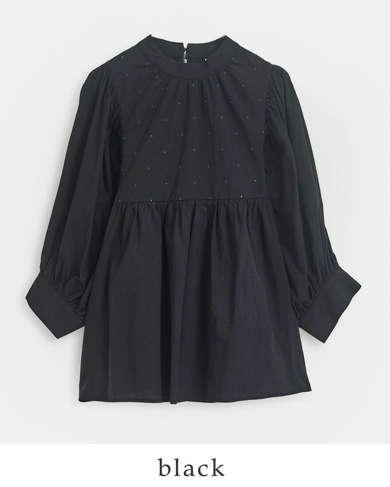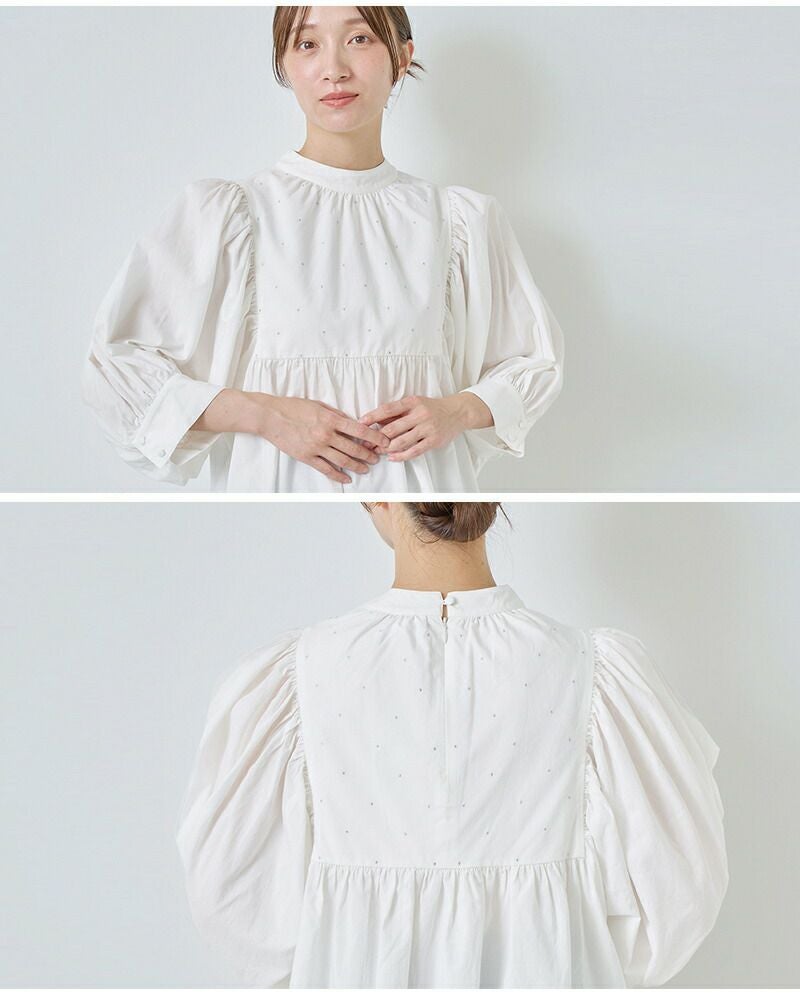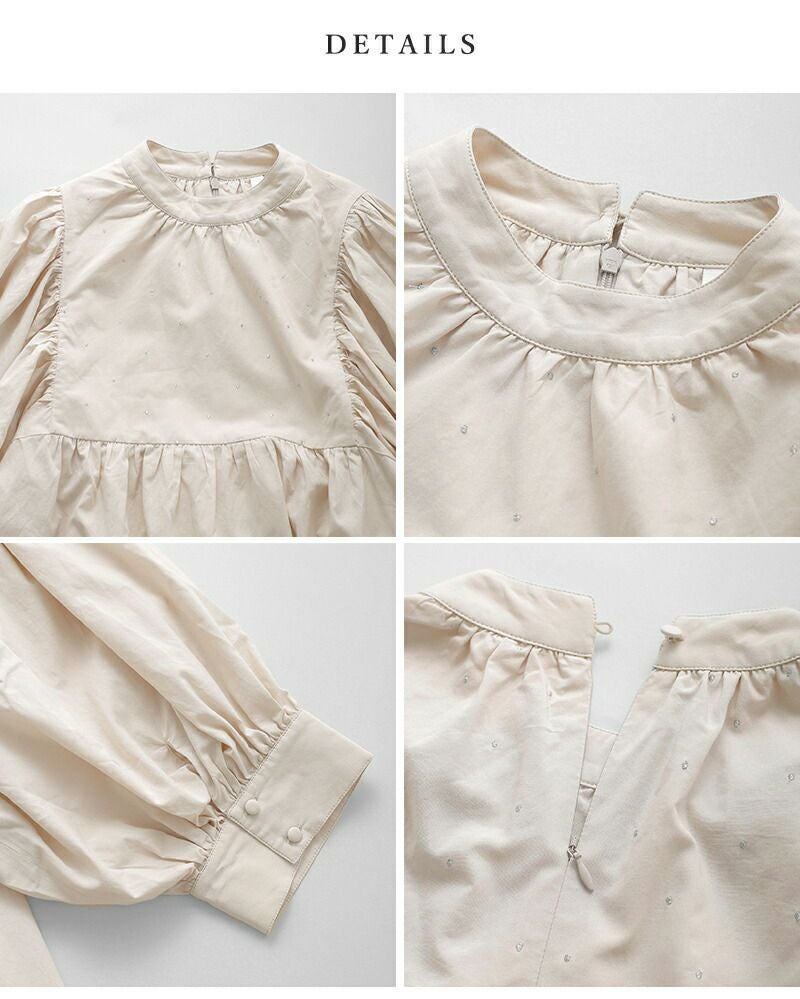 身頃全体に散りばめた繊細なラメ糸のドット刺繍が、控えめながらも華やかな表情を演出。 ウエスト位置のギャザー切替で、ふんわりと広がる女性らしいシルエットに仕上げています。
