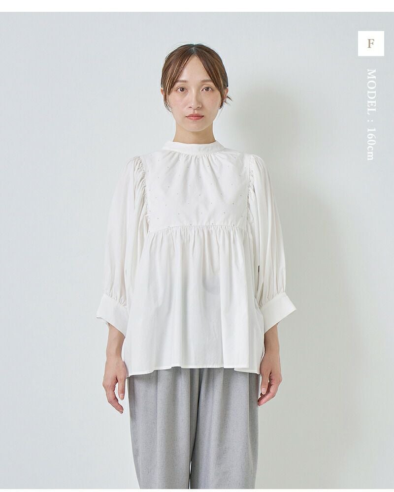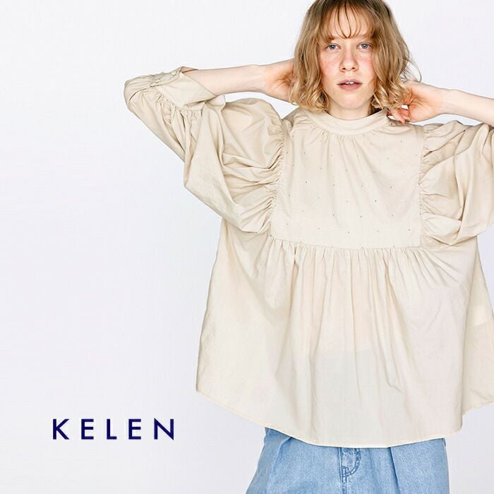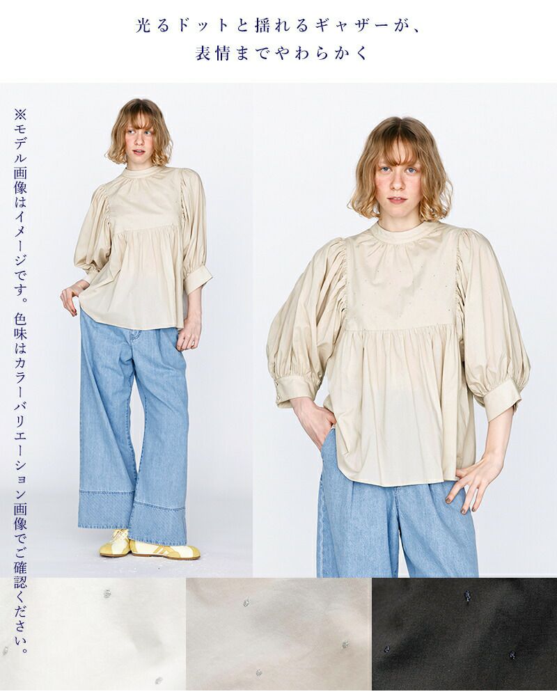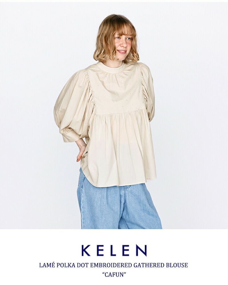 kelen(ケレン)より、ラメ糸ドット刺繍 ギャザー ブラウス “CAFUN” をご紹介します。 さりげなく輝くラメ糸のドット刺繍が、上品な華やかさを添えるギャザーブラウス。 コットンレーヨン素材のしなやかな落ち感と柔らかな肌触りで、快適な着心地を実現します。 袖とウエストに施したギャザーが、体のラインを拾わずふんわりとしたシルエットに。 詰まり気味のネックが甘さを程よく引き締め、大人フェミニンな印象に仕上げています。 デニムからスラックスまで幅広く合わせやすく、デイリーにもきれいめにも活躍する一枚です。