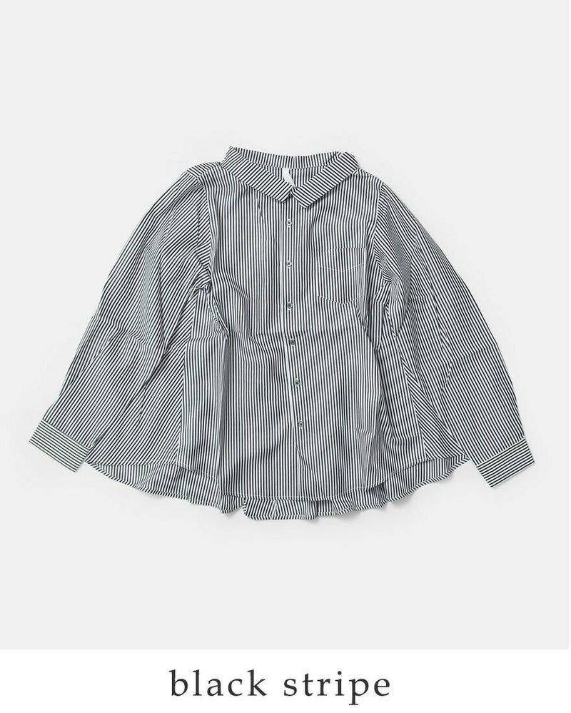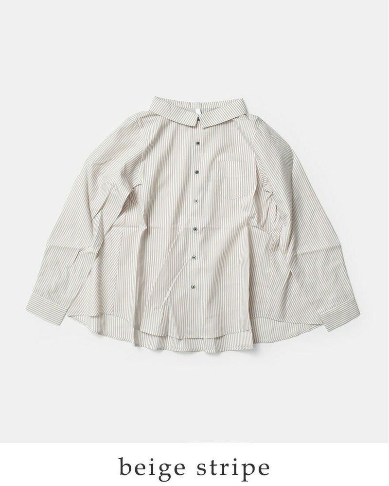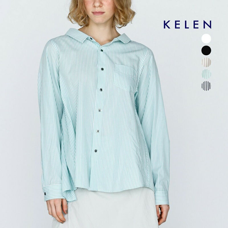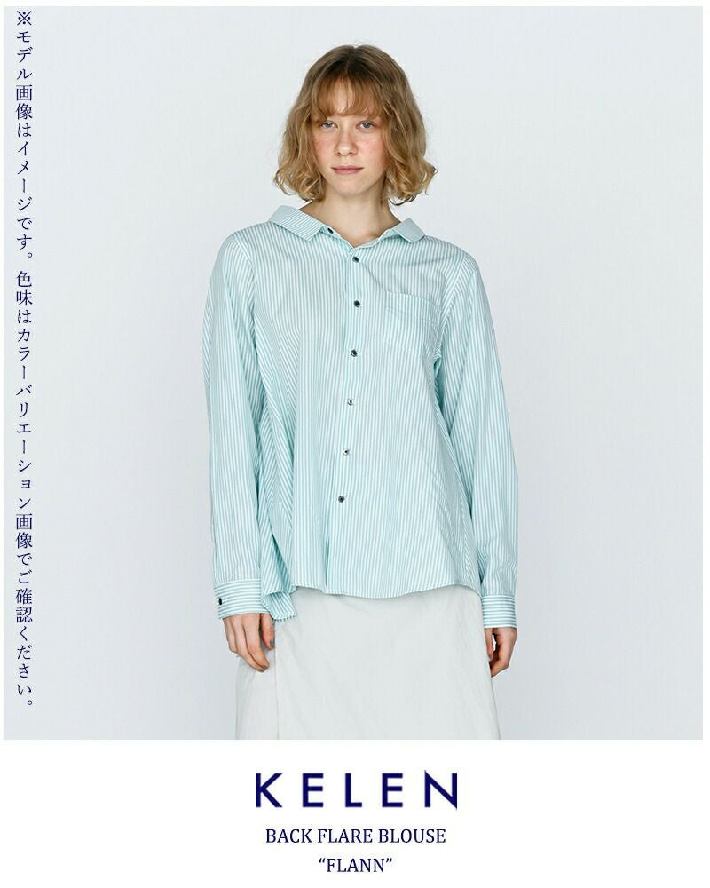 kelen(ケレン)より、バックフレア ブラウス “FLANN” が届きました。背中に大きくフレアーパターンでドレープを入れたブラウス。フロントはすっきりした印象。やや広めに設定している襟はパターンで立ち上がるように設定し、シンプルすぎないブラウスのポイントにしています。さわやかな印象のストライプ2色とクリーンなホワイト・ブラックの展開。胸元の小ぶりなポケットや、華奢なサイズのカフスで女性らしい着こなしが可能な1枚。