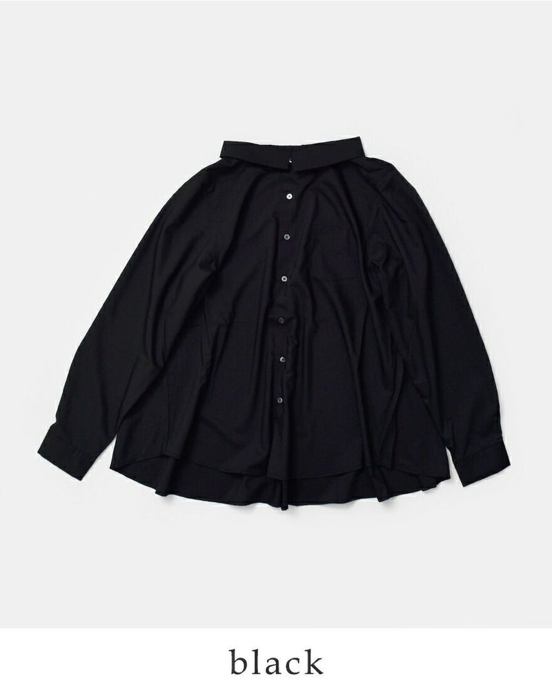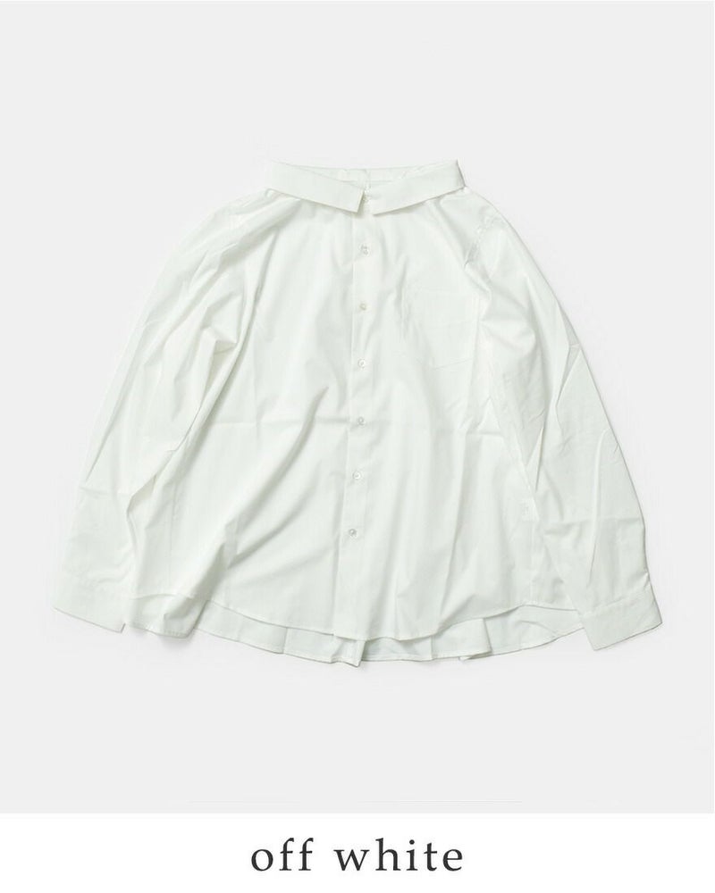 袖口はシャツらしいきちんと感のあるカフス仕様で、クリーンな印象をキープします。裾は前後差をつけたゆるやかなラウンドカット。