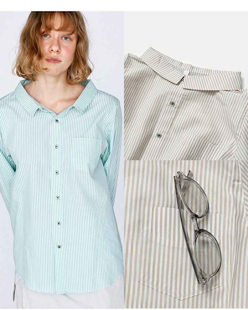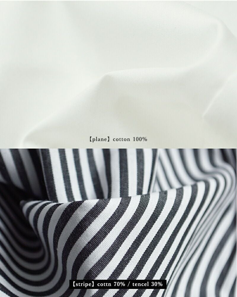 【ストライプ】綿 100% ストライプは、ほんの少しハリ感のある生地感で、スタンダードなシャツらしい布帛素材。 【無地】綿 70% テンセル(再生繊維) 30% 無地はテンセルミックスですこし滑らかさを感じる素材。すべすべとした肌触りが心地よいです。